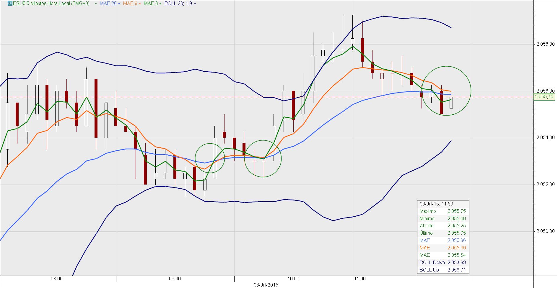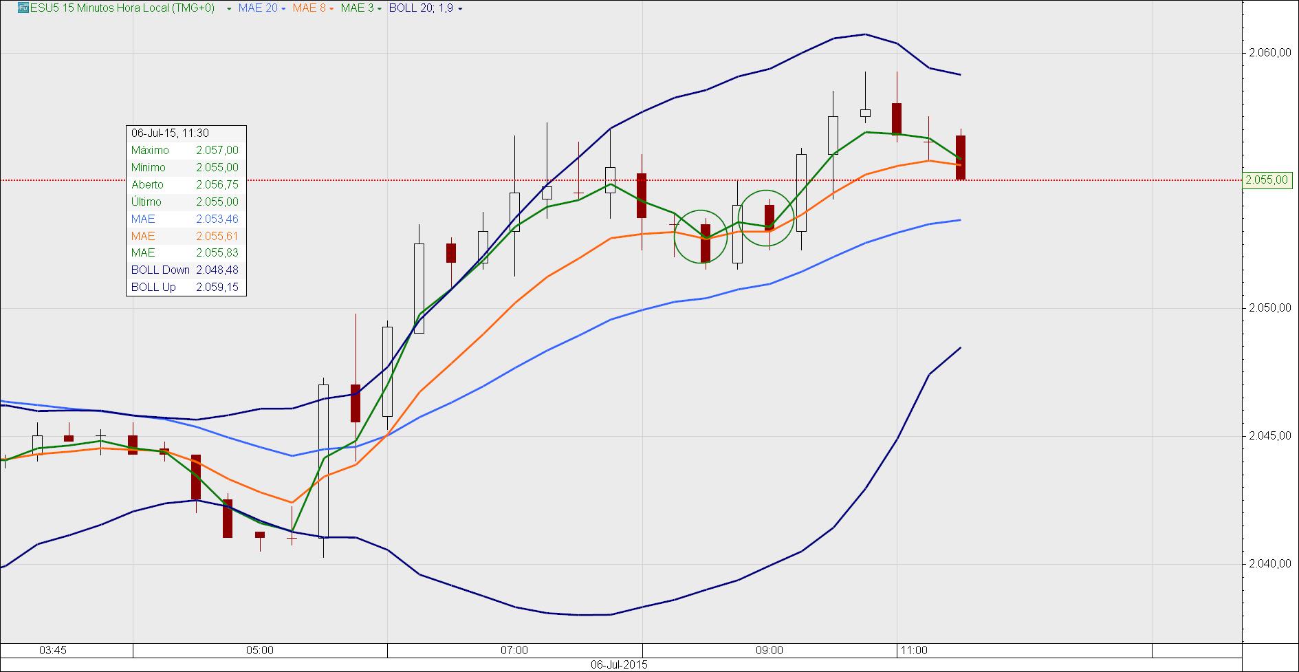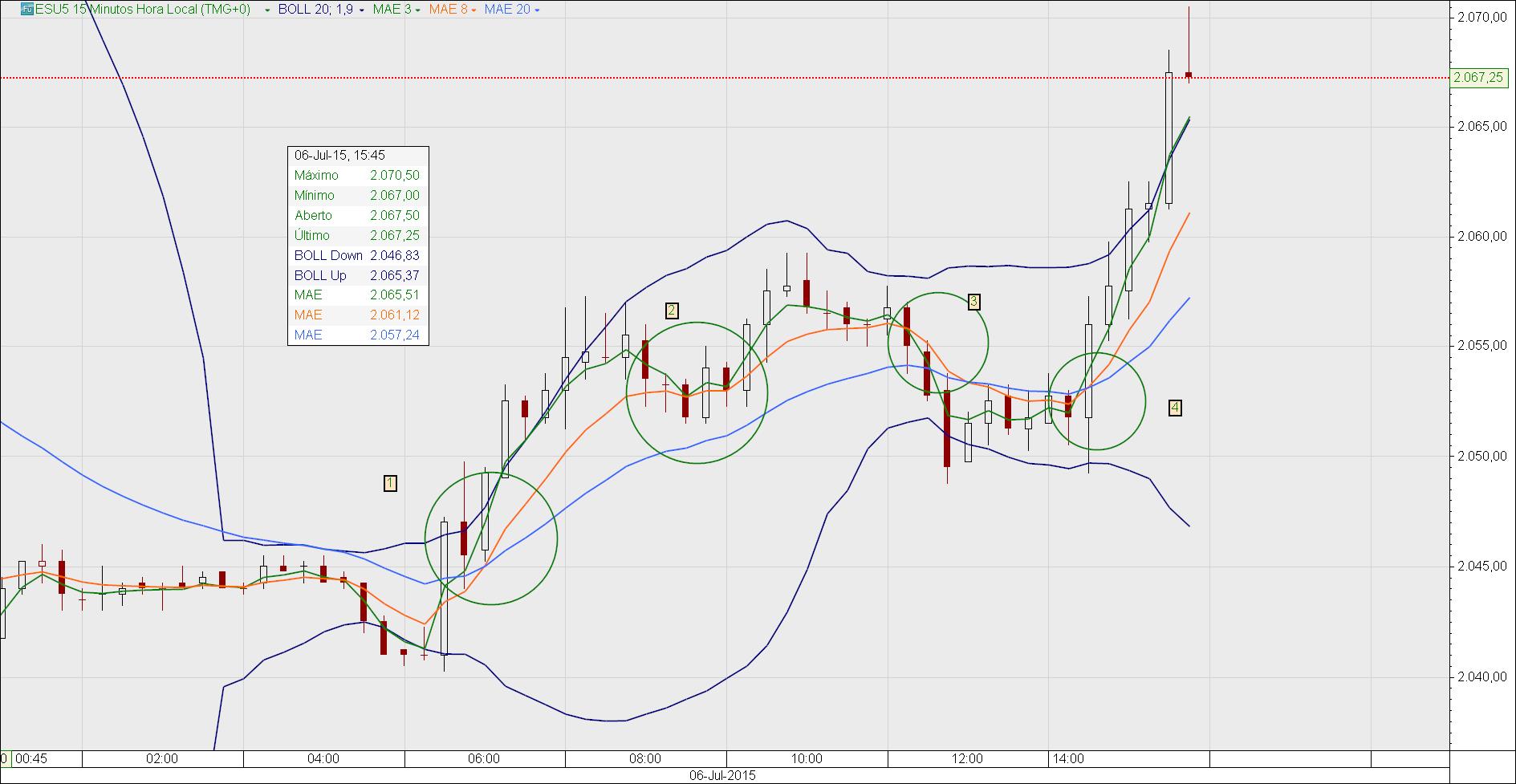 Magnifico e espetacular. Produtivo simples objetivo pratico com um custo mínimo de tempo de cálculos e reflexões . O setup das 3 médias exponencias de 3,8,20 com a 3 em cima a 8 no meio a de 20 abaixo dentro do corpo do candle é o sinal de entrada e as três médias novamente a de 3, 8 e 20 com a de 20 acima com a de 8 ao meio e a de três abaixo dentro do corpo do candle é o sinal de saída. Com a continuidade de operações pode-se observar uma série clara de variações que conduzem também a consideração de ser um sinal. Não é necessário experimentação pois o setup não altera-se é necessário observação. Os tempos gráficos de 15 e 5 minutos são extremamente precisos também podemos utilizar o tempo gráfico de 5 e 1 minuto. O setup e o ativo da classe futuros agora sei foram feitos um para o outro em day trading. Os futuros também possuem uma característica de poderem ser negociados praticamente 24 horas ao dia, gap-ups ou gap downs nas diversas aberturas do mercado global e a cada abertura e o fecho daquele mercado oscilações ocorrem e ai poderemos fazer uma enorme diferença. O futuro ESU5 mini SP500 é o dono desta festa entretanto não posso dar mais opiniões sobre futuros porque é a primeira vez e não será a ultima. O mais importante aqui é que o ativo escolhido para utilizar-se as medias 3, 8, 20 deve possuir alto volume de negociação. É a condição fundamental.