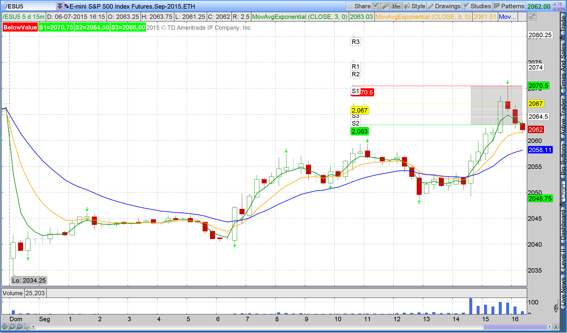 O primeiro gráfico mostra e o segundo gráfico mostra as etapas em fibo e os limites que foi de 2070. Alem das médias e o fibo anteriormente estudo e inserido acrescentei mais um sinal que auxilia as decisões que é o TTM_ScalperAlert http://tlc.thinkorswim.com/center/chart ... Alert.html