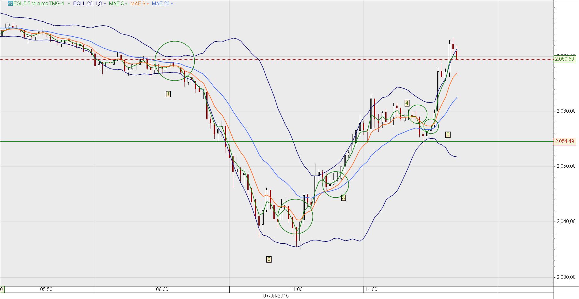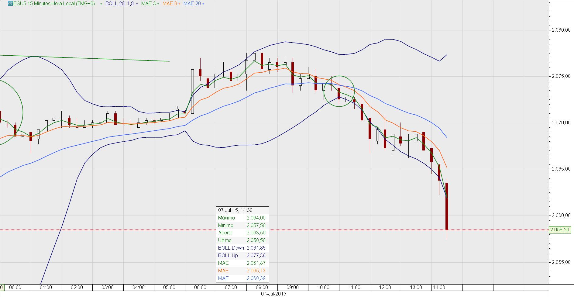 E assim segue a confirmar indo em direção aos 2054, e há ali um sinal de short com as médias a cruzarem-se nas posições corretas para o short ou venda com a media de 20 em cima a de 8 no meio e a de 3 abaixo assim fez-se um belo short.