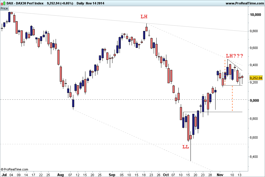 ao contrário do SPX no dia 24/9/2014 (altura do escrito), o DAX não está bullish nem no horário, nem no diário.na minha opinião está bearish sendo fez um lower high e vamos ver onde fará o low...