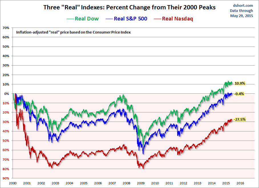 9) A propalada valorização do S&P500, do nasdaq e do Dow desde os máximos de 2000, é uma falácia se descontarmos a inflação (ver gráfico)