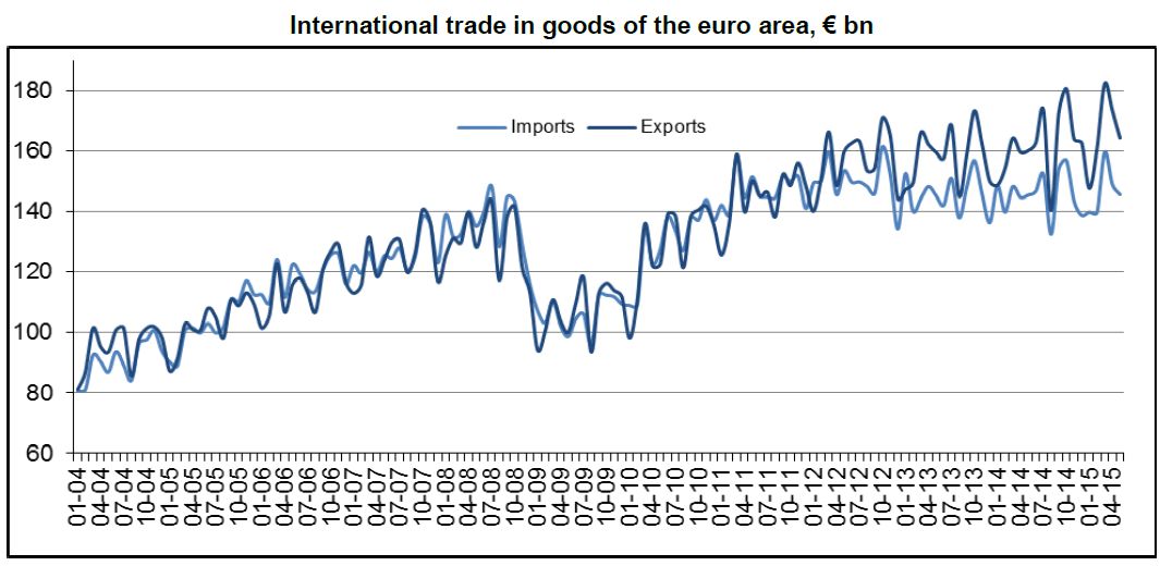 Apesar da contração grega já em Maio (economia que representa 1.9% da Eurozona), o “segredo” não está centrado na impressão mensal de 60 mil milhões de euros, nem na redução dos défices nacionais, nem na desvalorização do euro (target na paridade após 1º aumento tx juro USA, em Outubro?), nem na redução do desemprego, nem na moderação do IPC. A força do mercado prende-se com as exportações! Cresceram a um ritmo de 3% em Maio (4,3% em Espanha), quando se esperava o início da saudável desaceleração sasonal. O superávit mensal, de 18.800 mil milhões de euros, só não foi maior por causa de um aumento de 2,2% nas importações.