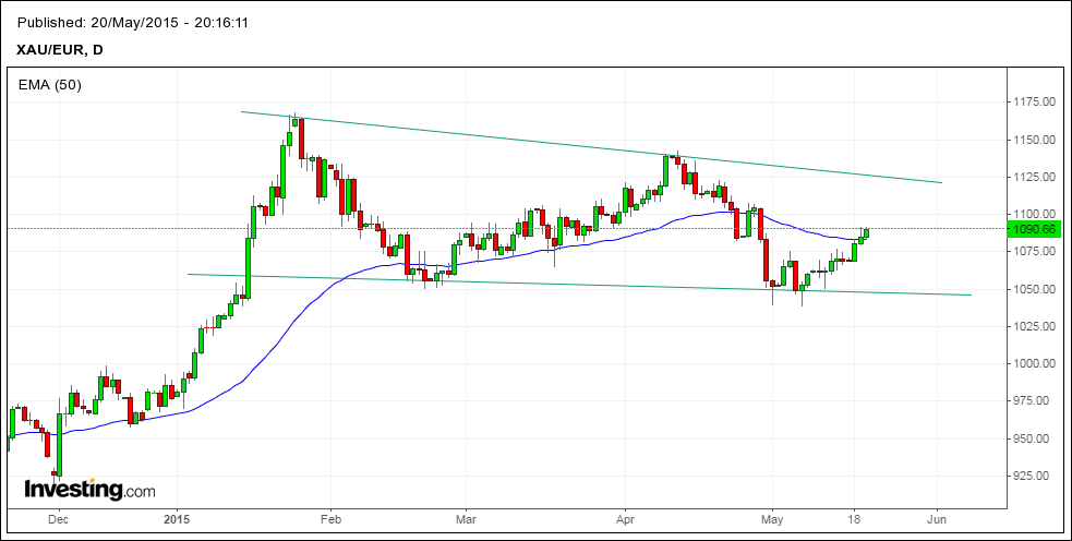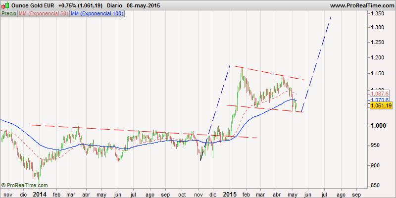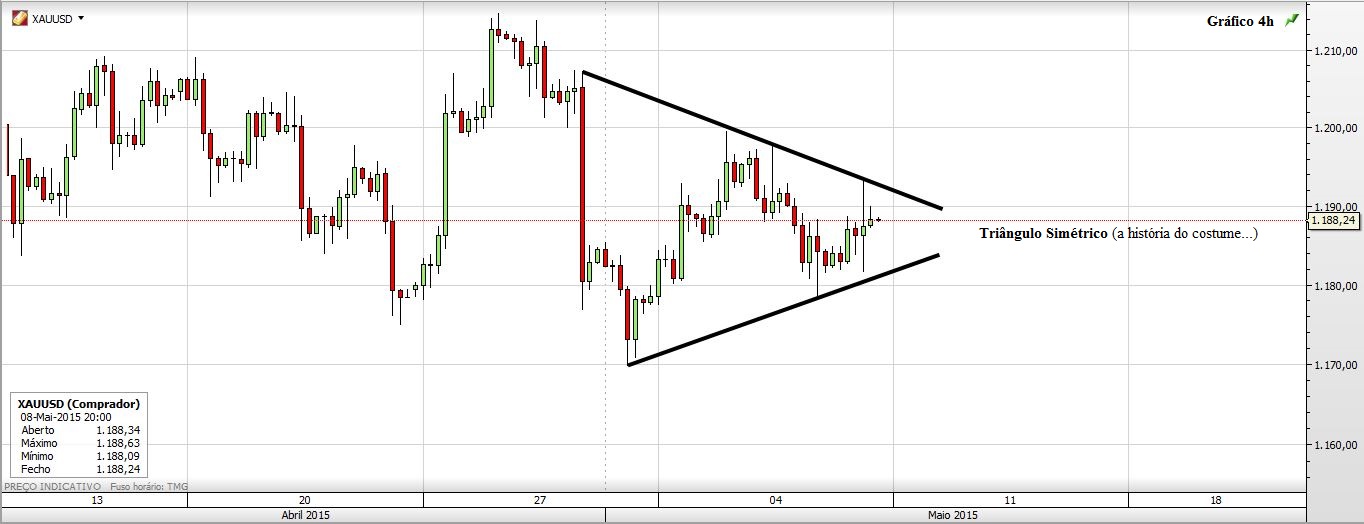 É sempre bom ver alguém a falar do Ouro, activo que sempre acompanho apesar de não o negociar há já algum tempo... mas olhando para o Ouro eu acho que ele estará mais para cair do que para subir... de qualquer maneira existe um Triângulo Simétrico no Gráfico de 4 horas que deverá ser quebrado na próxima sessão e tirar as duvidas a propósito do sentido no curto prazo. Para mim ele vai quebrar para baixo. Já no XAUEUR parece estar ali a formar-se um Triângulo Descendente que normalmente também quebra para baixo... para além do último máximo e mínimo relativo mais baixos no diário. Mas acho que o importante é esperar para ver o que acontece com aquele triângulo simétrico.