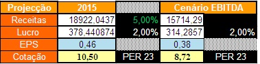 A partir desse valor, e com base numa margem lucro sobre as vendas de 7% (2014) e num PER de 15 (inferior ao actual), fiz a seguintes projecções para 2015.