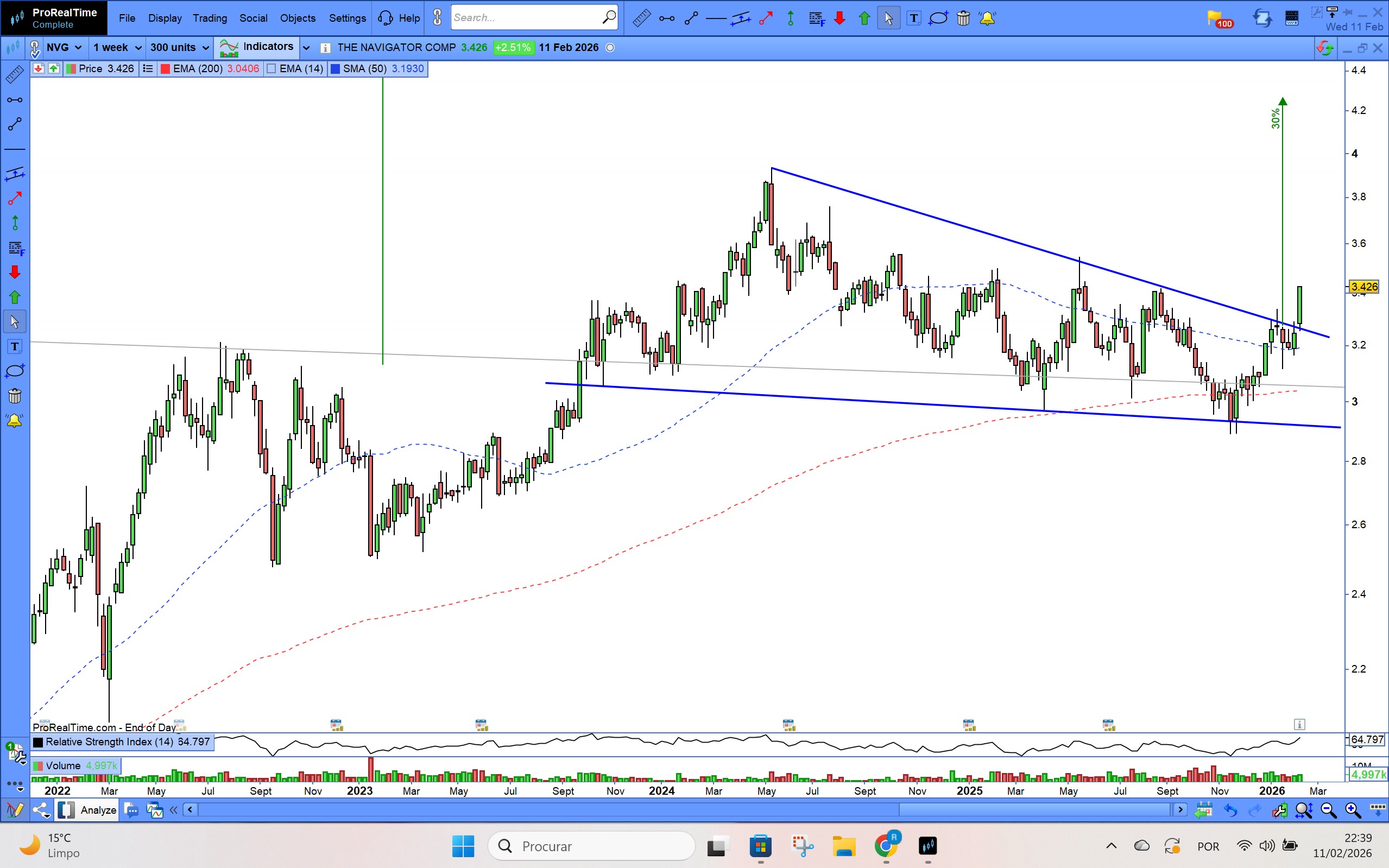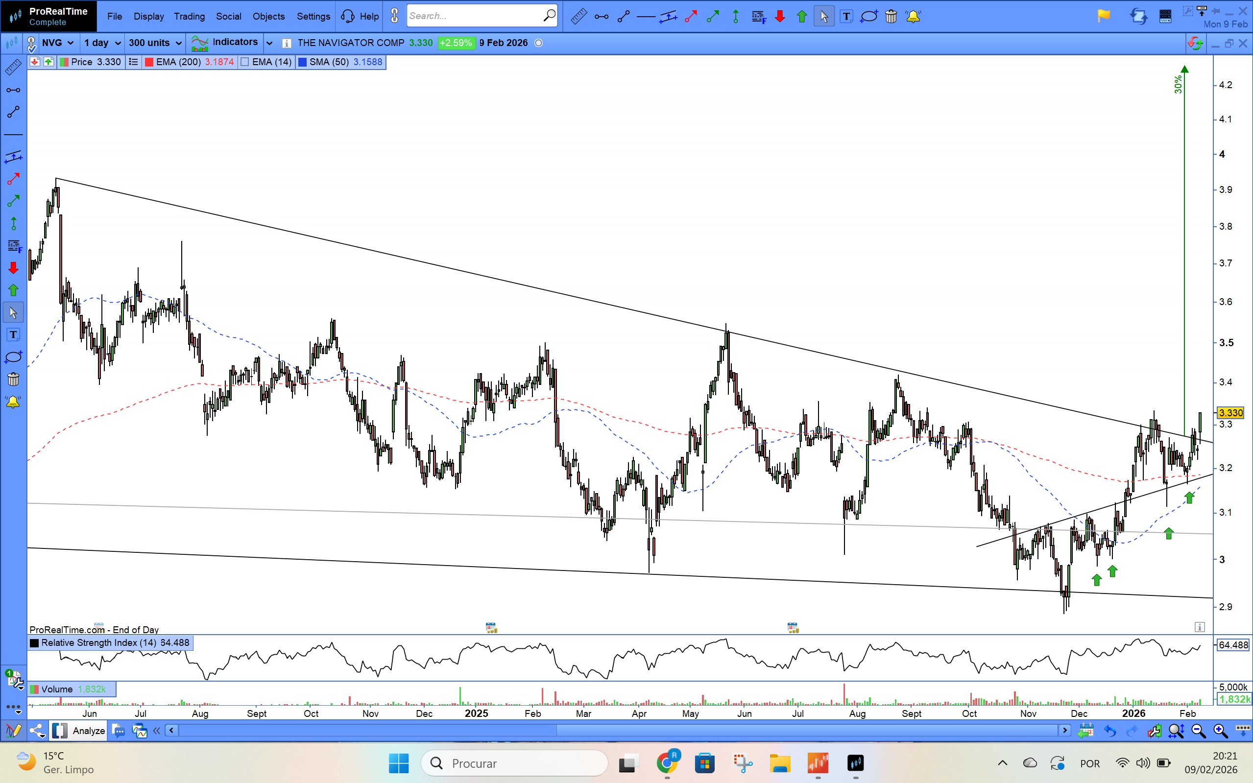 Parece ter uma formação de cup & handle, e hoje teve um pouco de mais de volume. Vamos ver se confirma. Pelos meus cálculos, chegará aos +/- 3,70 euros.