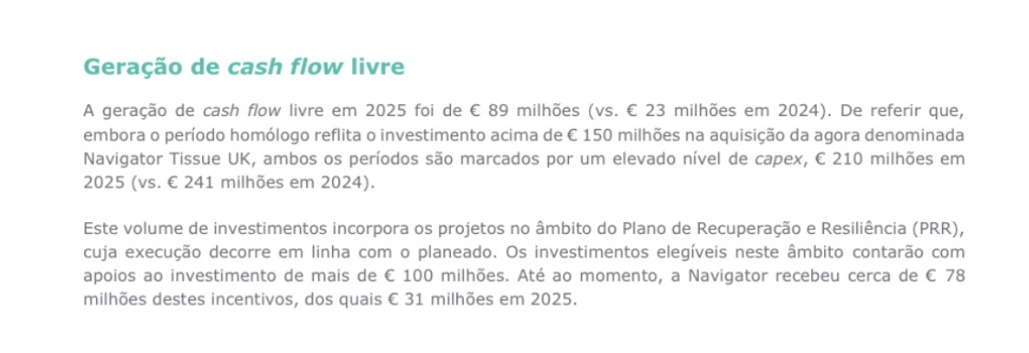 Em 2025 o preço da pasta e do papel caiu 15% e do papel de escritório caiu 9%. Resumidamente, isto explica a queda dos lucros. Nada de estrutural, apenas conjuntural, a quebra do preço da matéria prima. Mas a Navigator aproveitou para ganhar cota de mercado. Um ponto cinco pontos percentuais. Continua a diversificar, Tissue e de Packaging já contribuíram com 29% das Vendas, com uma nova máquina tissue que vai aumentar as margens e provavelmente a produção. E há a entrada em novos negócios nomeadamente, pratos e tigelas de fibra.