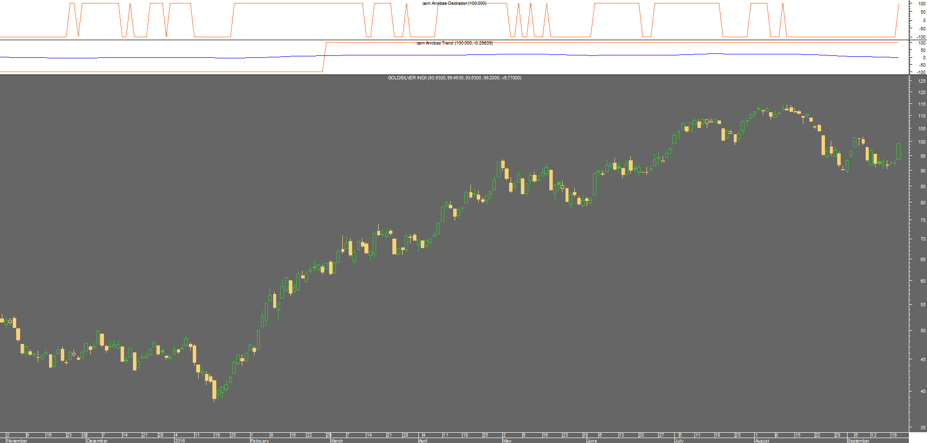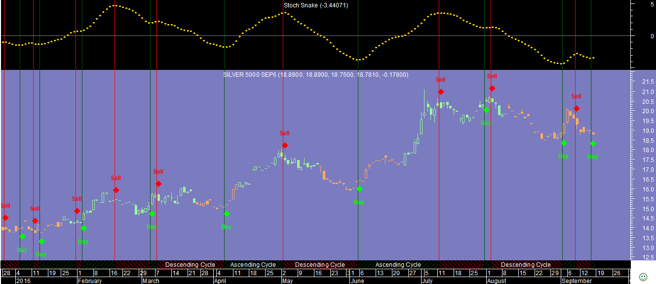 Outra questao curiosa prende-se com a aparente boa calibragem dos sinais na componente oscilatória, que aparentemente terao detetado um mínimo cíclico do mercado da Prata na 6ª feira passada como se pode ver no 3º gráfico abaixo.