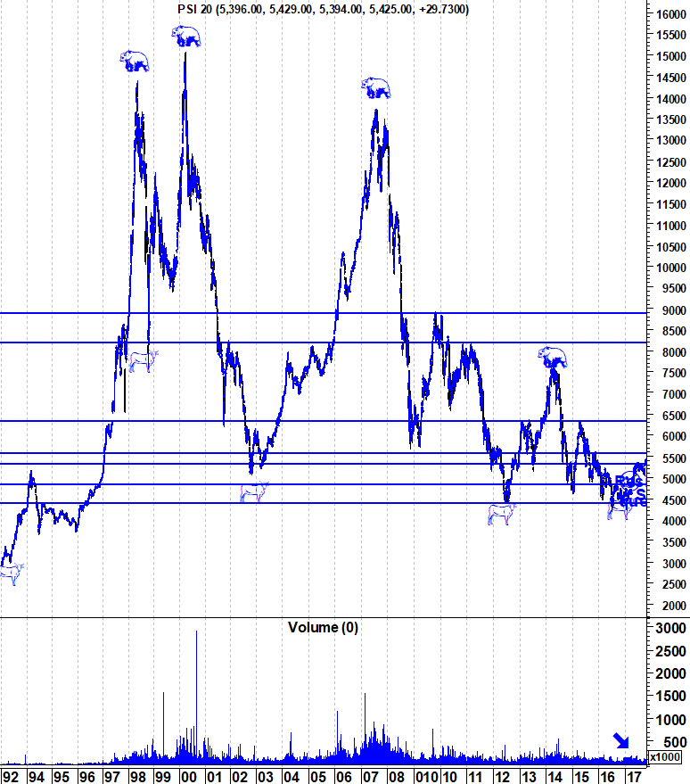 Deixo aqui os gráficos de médio, longo e muito longo prazo para melhor ilustrar o actual momento da Bolsa portuguesa.