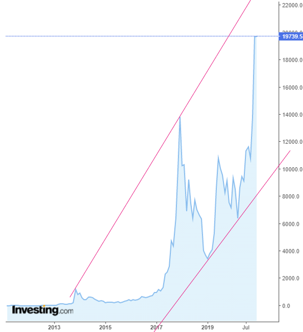 se puderem postar um grafico de longo prazo ... parece-me que tem potencial para subir até aos 24000 onde tera uma resistencia para depois corrigir forte aos 13000 onde tera suporte.