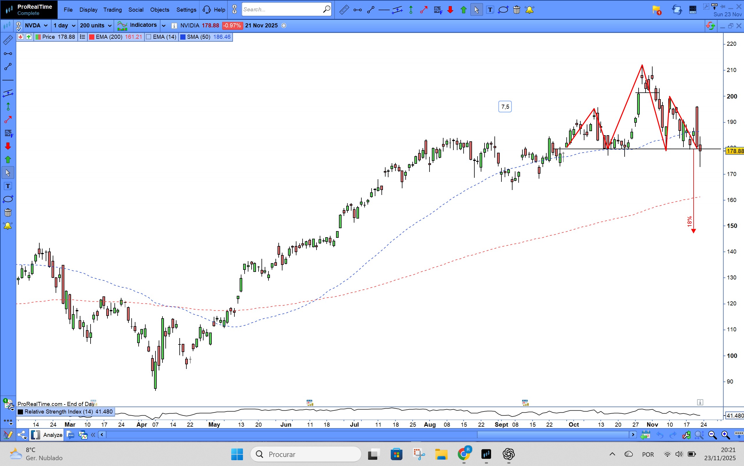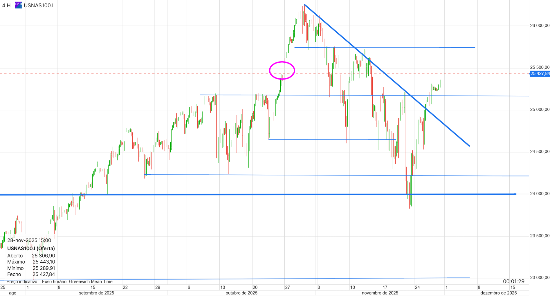 Acho que as linhas no gráfico de 4 horas fazem sentido, mas era difícil antecipar a lateralização. Acho que vai acabar por ir para cima, porque o Russell e o Dow Jones já fizeram novos máximos. Acho provável que o Nasdaq também faça, mesmo se descer na segunda e perder a linha de suporte no gráfico de 4 horas durante algumas horas ou um dia. O Nasdaq pode estar pior porque foi o que subiu mais, e há vários analistas a dizer que o impacto da IA pode não ser o esperado. No entanto, é difícil dizer se vai continuar assim ou se é momentâneo