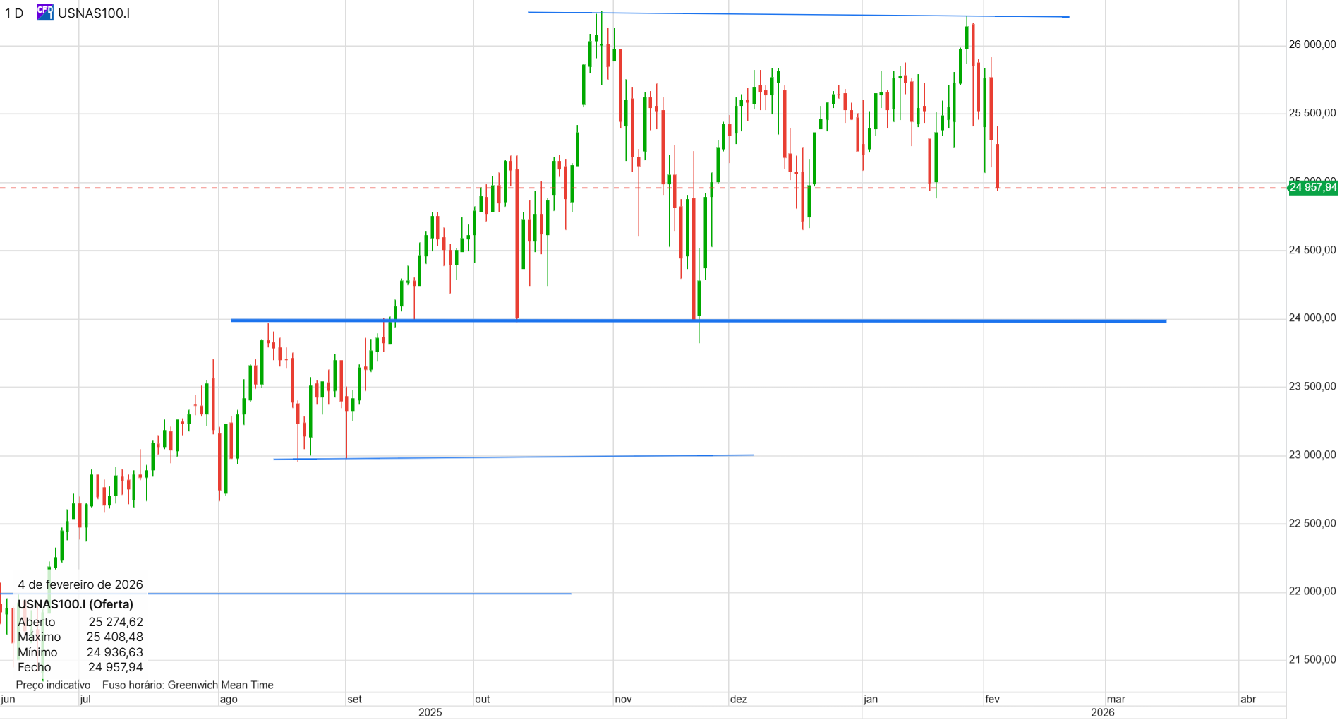 Não tenho posições, mas espero abrir uma longa amanhã (o ideal era fazer um teste aos 25200, seria o ponto ideal de entrada).
