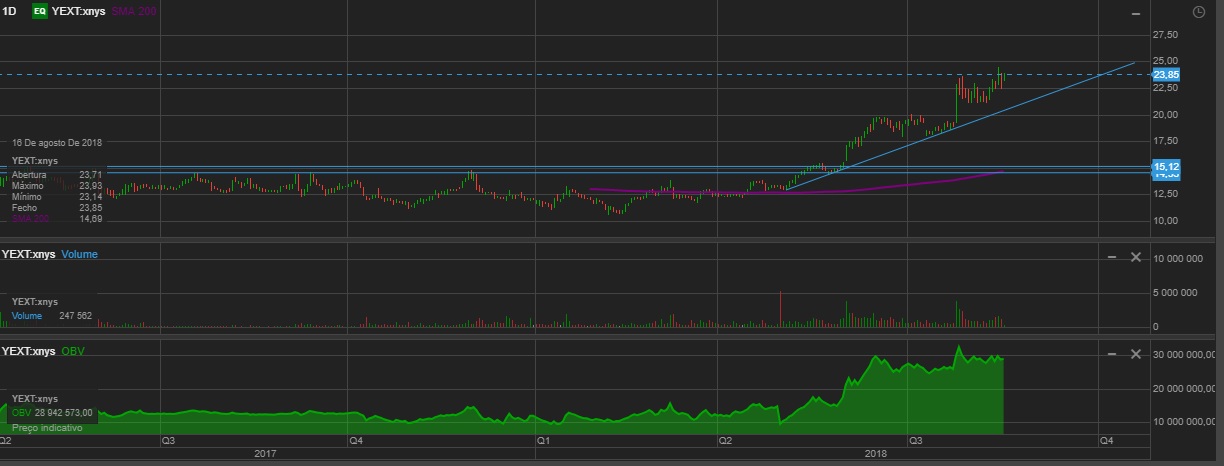Pela informação do "stockflare.com" esta empresa no período de três meses encerrado em 30 de abril de 2018, as receitas da Yext Inc aumentaram 38%, para US $ 51,1 milhões. O prejuízo líquido aumentou 13%, para US $ 18,1 milhões. As receitas refletem o aumento do segmento América do Norte de 28% para US $ 44,9 milhões, o segmento internacional aumentou de US $ 2,2 milhões para US $ 6,2 milhões. Maior perda líquida reflete Vendas e marketing - Equilibrar o aumento de valor de 27% para US $ 33,3M (despesa), Pesquisa e desenvolvimento - Aumento de 40% para US $ 6,2M (despesa).