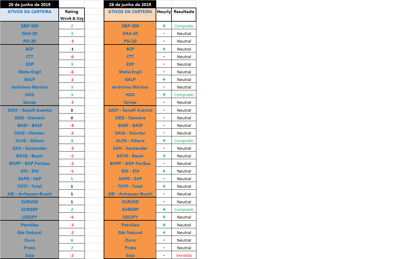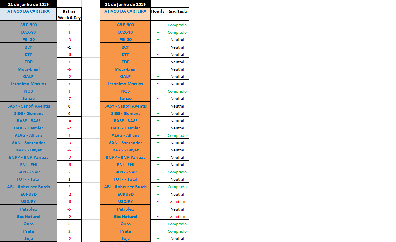 Abaixo fica o quadro resumo semanal com os ratings do conjunto semanal/diário, os sentidos dominantes horários e as posiçoes aconselhadas correspondentes.