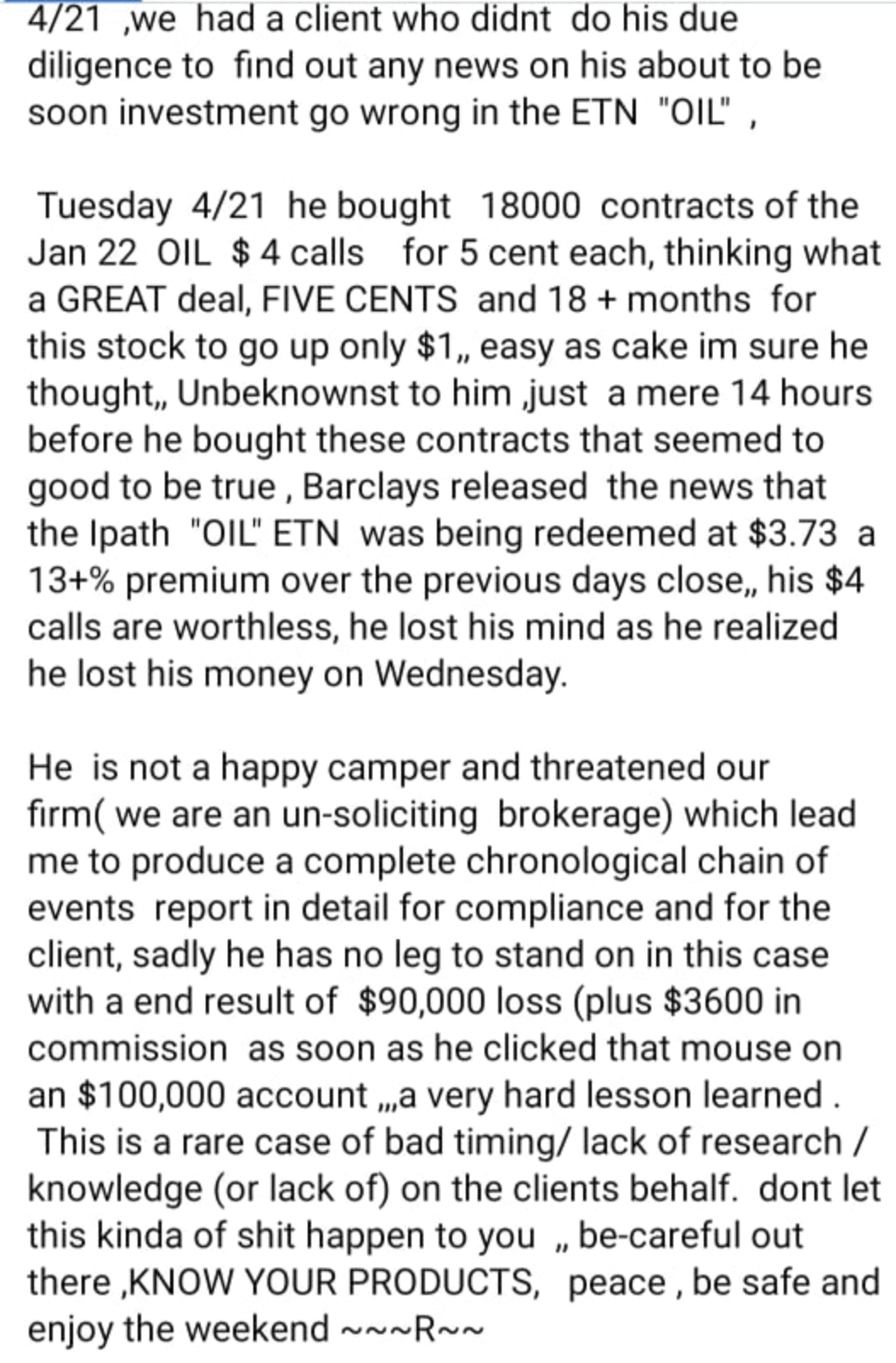 Atenção a eventuais problemas que podem advir com a Interactive Brokers, resultado do que ocorreu na semana passada com as margin calls de clientes que não tinham provisão de dinheiro suficiente em contas de posições longas em futuros do petróleo que rebentaram e que, se não compensarem a corretora, terá de ser a Interactive Brokers a assumir as compensações financeiras perante a CME e a ICE nos resultados dos fechos dos contratos de futuros encerrados com perdas enormes.