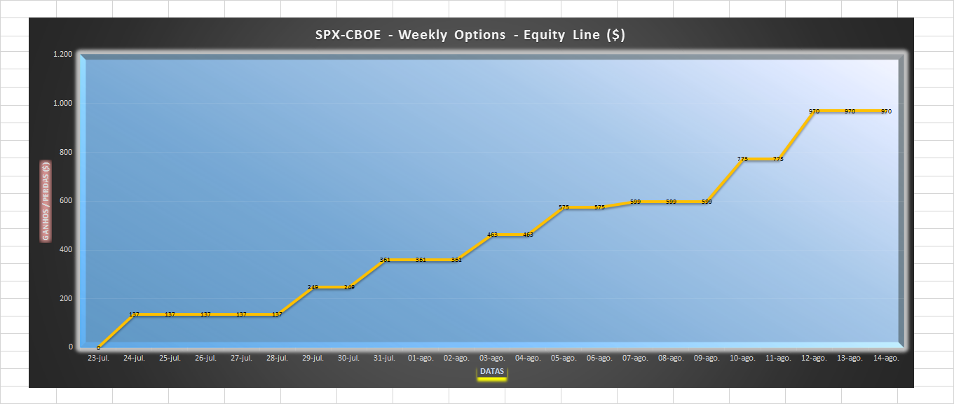 Q) Ao preencher algumas das conclusões atrás estabelecidas podemos completar alguns detalhes em falta. Para arriscar numa estratégia que assenta principalmente no aproveitamento das vendas de opções de muito curto prazo, que permitem desvalorizações muito rápidas, de preferência em casos de subjacentes quase laterais ou “parados” e que se comportem bem através de tendências bastante “obedientes” ou transparentes de elevada liquidez incidindo em conjuntos de ordens “bid-ask” muito curtos ou altamente competitivos, podemo-nos focar simplesmente nas opções semanais do SPX, que dependem unicamente do seu subjacente índice S&P 500 cash. Estas opções semanais Call e Put sobre o SPX de muito curto prazo encerram todas as semanas às 2ª feiras, 4ª feiras e 6ª feiras de qualquer semana. Os strikes do SPX correspondem a toda uma sequência de escolha possível sobre o valor da dezena de pontos do S&P 500: por exemplo, o strike 336 no SPX corresponde ao valor de 3360 pontos no índice S&P 500, podendo coexistir sempre Calls strike 336 e Puts strike 336. Por outro lado há que chamar a atenção que a cotação corresponde ao seu valor em dólares americanos multiplicado pelo factor 100: exemplificando, se dissermos que um Call do SPX de 14 de agosto do strike 338 custa 1.82 $, na verdade teremos de desembolsar 182 Usd para comprar essa opção Call.