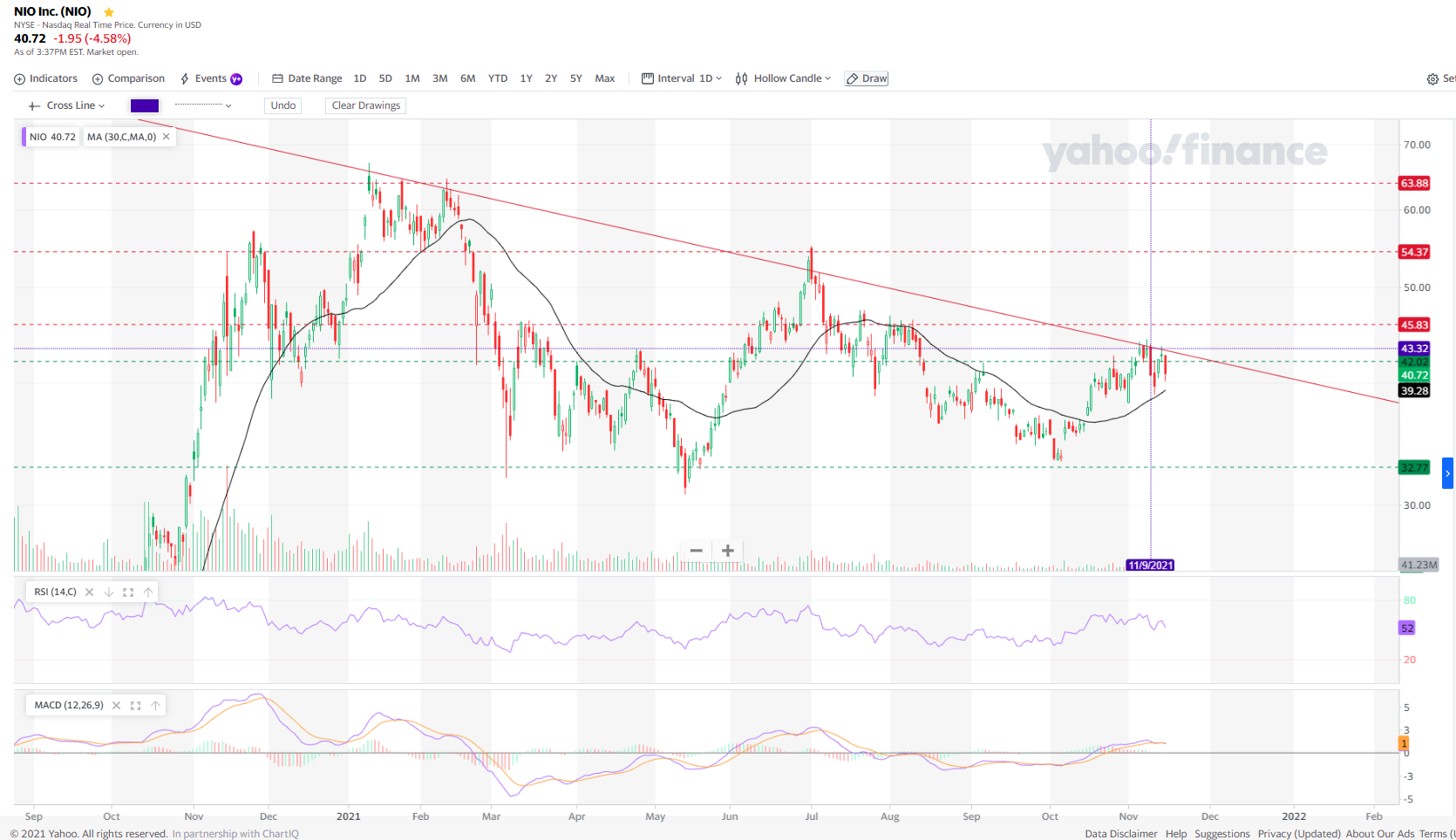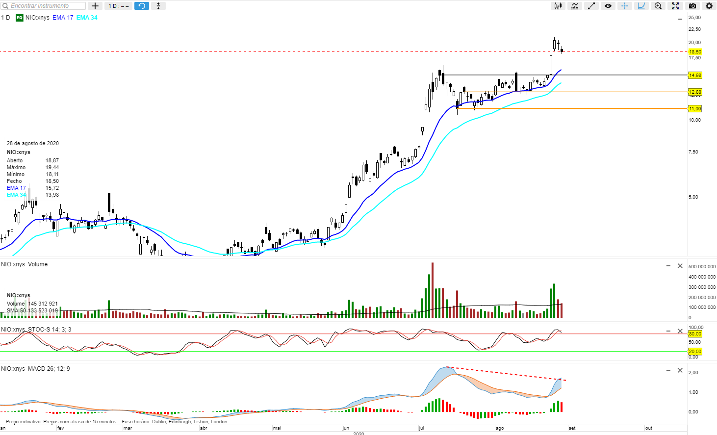 No gráfico podes ver os pontos mais relevantes. Se pensas mesmo entrar na NIO assumindo mais risco e sem esperar por sinais de reversão então olha mais para os 16.96$ a 16.76$.
