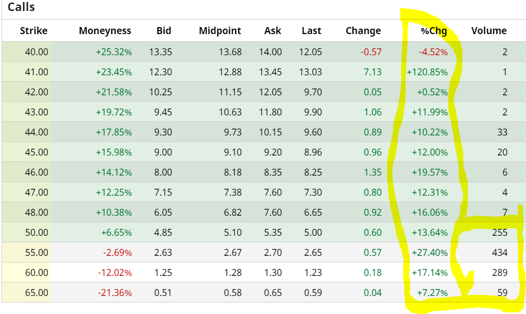 Aqui está um exemplo típico de uma ação cujas opções sinalizam bullish.
