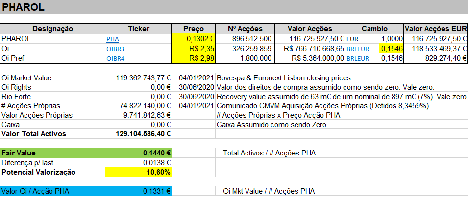 Na prática, os activos resumem-se à posição na Oi e ao dinheiro em caixa. Não me parece que, nesta altura, haja outros riscos não acautelados (a não ser riscos globais, mas aí apanhará todas as acções). Quer isto dizer que a PHAROL irá mover-se em função daquilo que a Oi fizer, com a atenção devida à cotação do Real que influencia brutalmente o valor dos activos. A Pharol é a 2ª maior accionista da Oi.