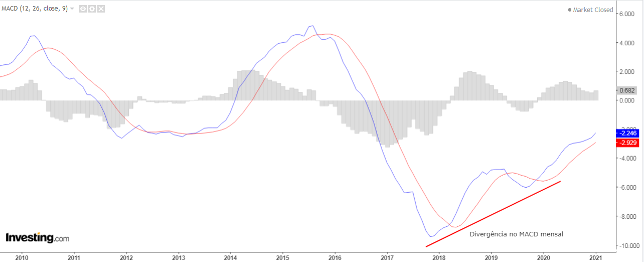 Está bearish e a lateralizar em fundo, mas tem uma divergência no MACD mensal formada desde final de 2017, acredito que ele um dia vai funcionar (não sei quando), mas acredito. O que me faz ficar optimistas e será o primeiro sinal de força é ela romper a resistência na zona dos 13,50 usd, se tal acontecer acredito na inversão, mas é preciso esse breakout nos 13,50.