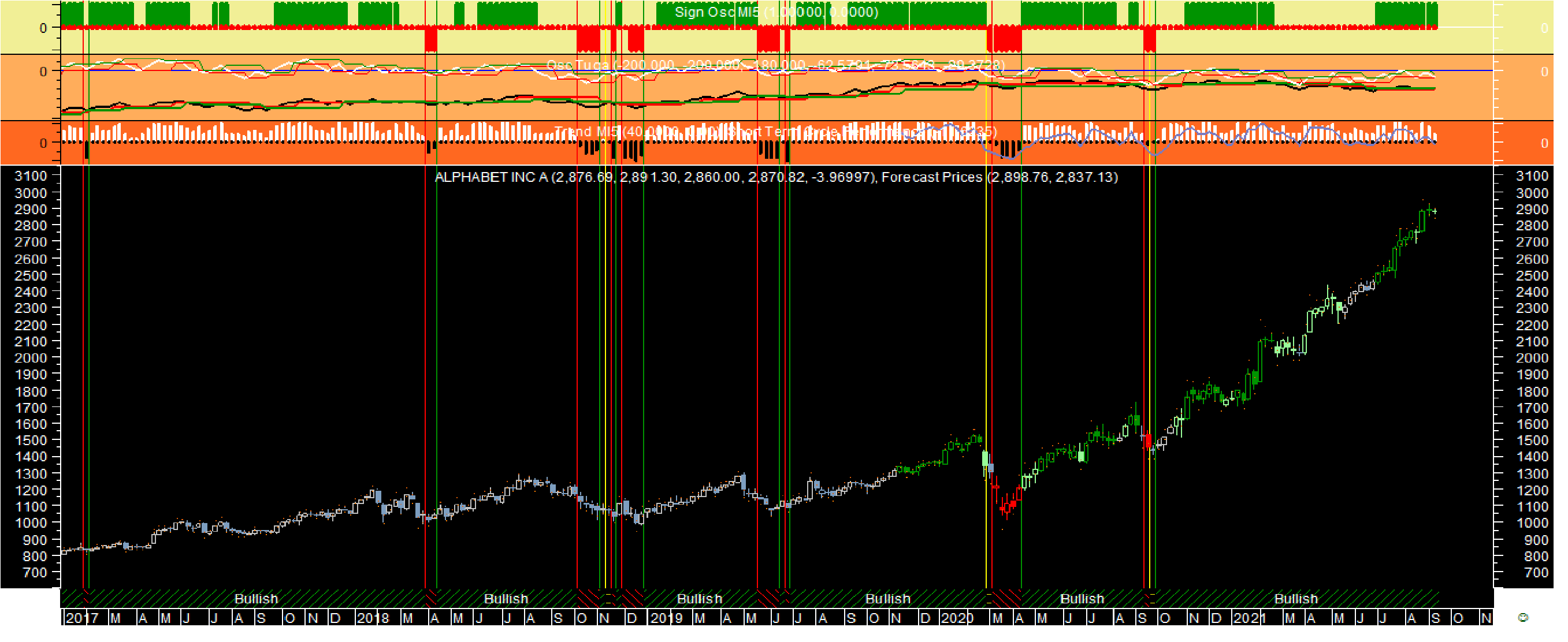 No caso concreto da Google ontem até foi um dia jeitoso para comprar no nível dos 2865 aos 2870. Porquê? Tinhas de ter várias condições simultâneas: indicadores tendenciais ascendentes nas escalas semanal e diária e indicadores tendenciais na escala horária a descer.