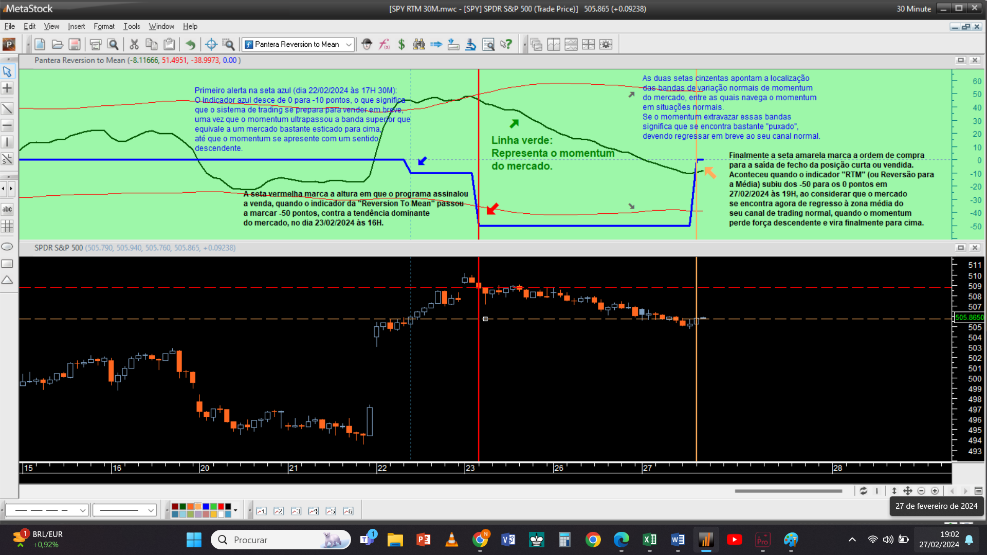 Para exemplificar melhor este método de trading, deixo ficar abaixo um pequeno exemplo recente na aplicação deste sistema de trading complementar, extraído do meu trading pessoal, na negociação do S&P 500, incidindo esta trade da Reversão para a Média na escala da meia hora ou 30 minutos.