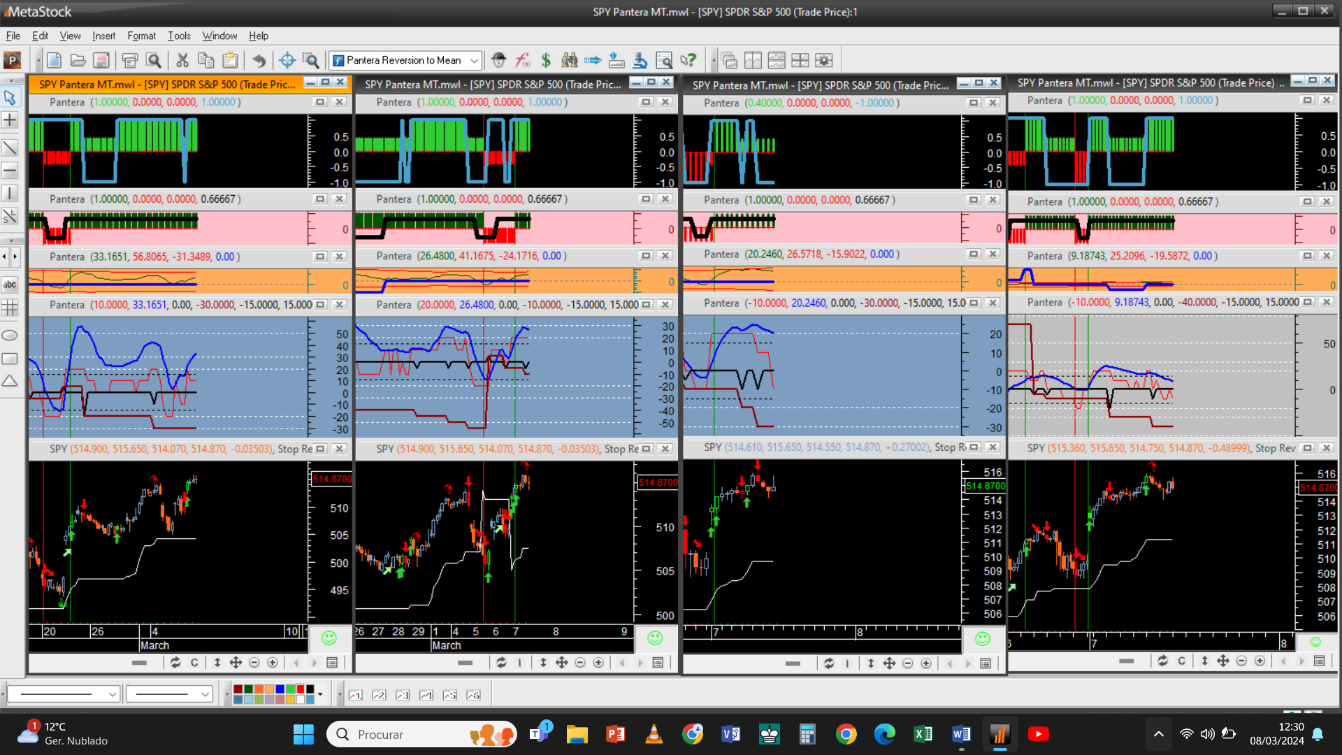 Bem, em primeiro lugar porque não confio em robots onde não me deixam ver como e de que forma esses indicadores estão programados, não podemos confiar apenas na propaganda comercial. Por aquilo que tenho observado e pela reação de muitos traders que usam ou usaram esses bots, só uma minoria deles, entre 5% a 15%, conseguem retornar alguns lucros. O problema ainda se agrava mais se pensarmos que a utilização de cada “bot” individual custa em média entre algumas centenas a poucos milhares de Euros mensais, independentemente dos resultados que possam gerar! Se usasse um robot para tendência e outro para reversão para a média, nesse caso teria de pagar por 2 robots. Ora, como eu uso no meu trading um conjunto de pelo menos 6 estratégias diferentes (tendência de médio/longo prazo, tendência de baixo/médio prazo, tendência do tipo stop and reverse, indicadores de convergência e divergência, indicadores de oscilação e indicadores de reversão para a média – ver exemplo abaixo dum layout do S&P 500 com escalas de 2H, 1H, 30M e 15M) o custo iria sair uma bela conta calada só para poder utilizar este pacote de robots, caso existissem de acordo com os parâmetros que entendo serem os mais adequados.