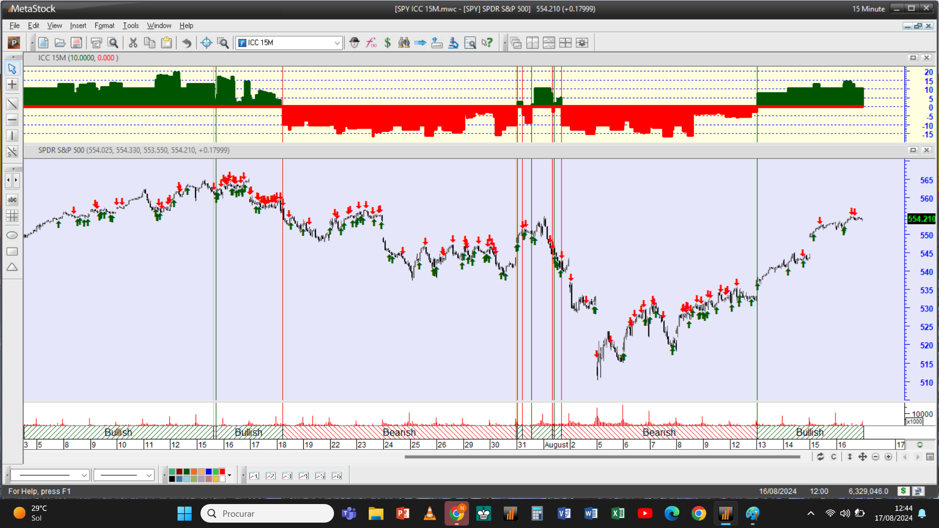 Houve também importantes operações nesta fase de subida no setor oscilatório que ajudaram a alterar o valor do ICC com alguma relevância. Refiro nomeadamente uma pequena compra na escala das 2 Horas e vendas sucessivas de fecho com algum peso em anteriores posições longas nos gráficos dos 15 Minutos, 30 Minutos e Horário.