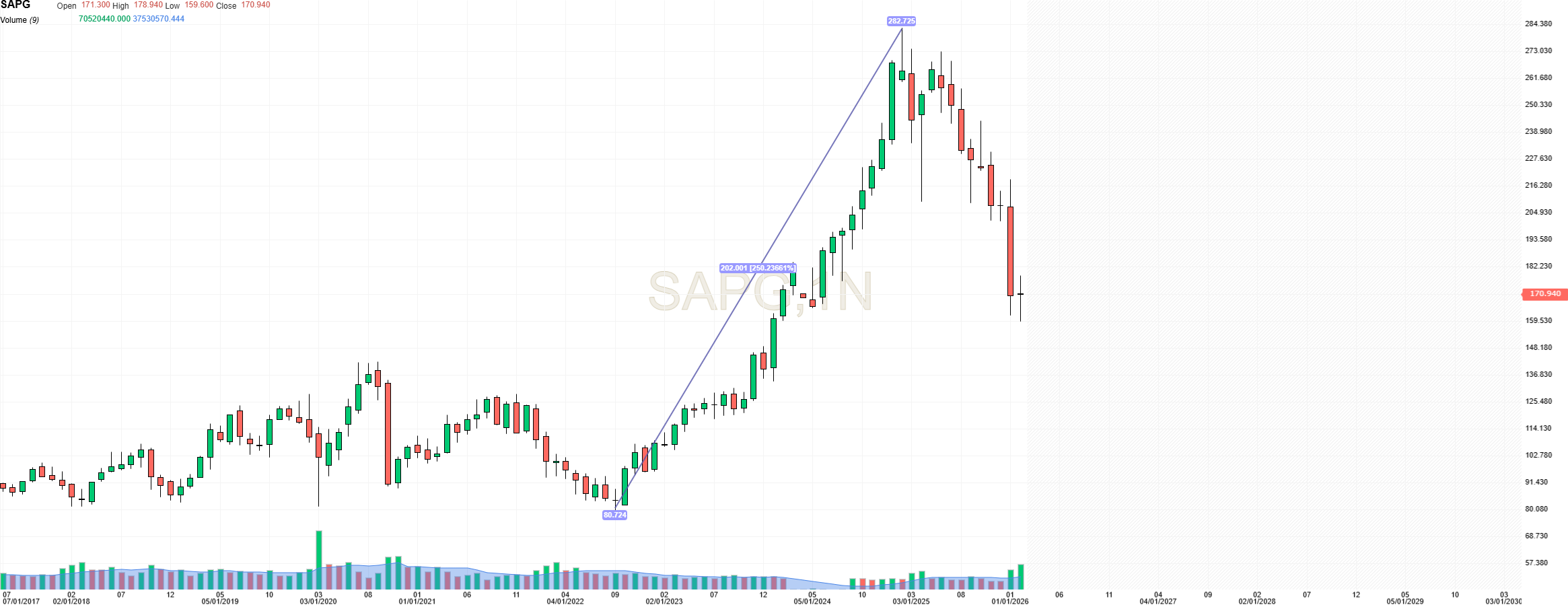 Talvez vá passar algum tempo sem escrever neste tópico, mesmo discordando de algumas coisas que são ditas, mas agora vou fazer uma brincadeira e dizer que, se eu fosse neste momento obrigado a abrir uma posição na sap seria longa (170,96).