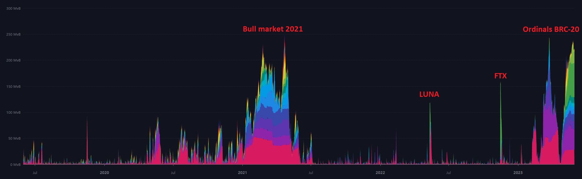 Podemos interpretar o aumento das taxas como um aumento da procura por transações bitcoin. Este incremento de rendimento para os mineradores é muito importante porque à medida que a recompensa por bloco baixa (halving, a recompensa passa para metade de 4 em 4 anos) é importante assegurar que existe algum incentivo para que continuem a operar, mantendo assim a rede muito segura.