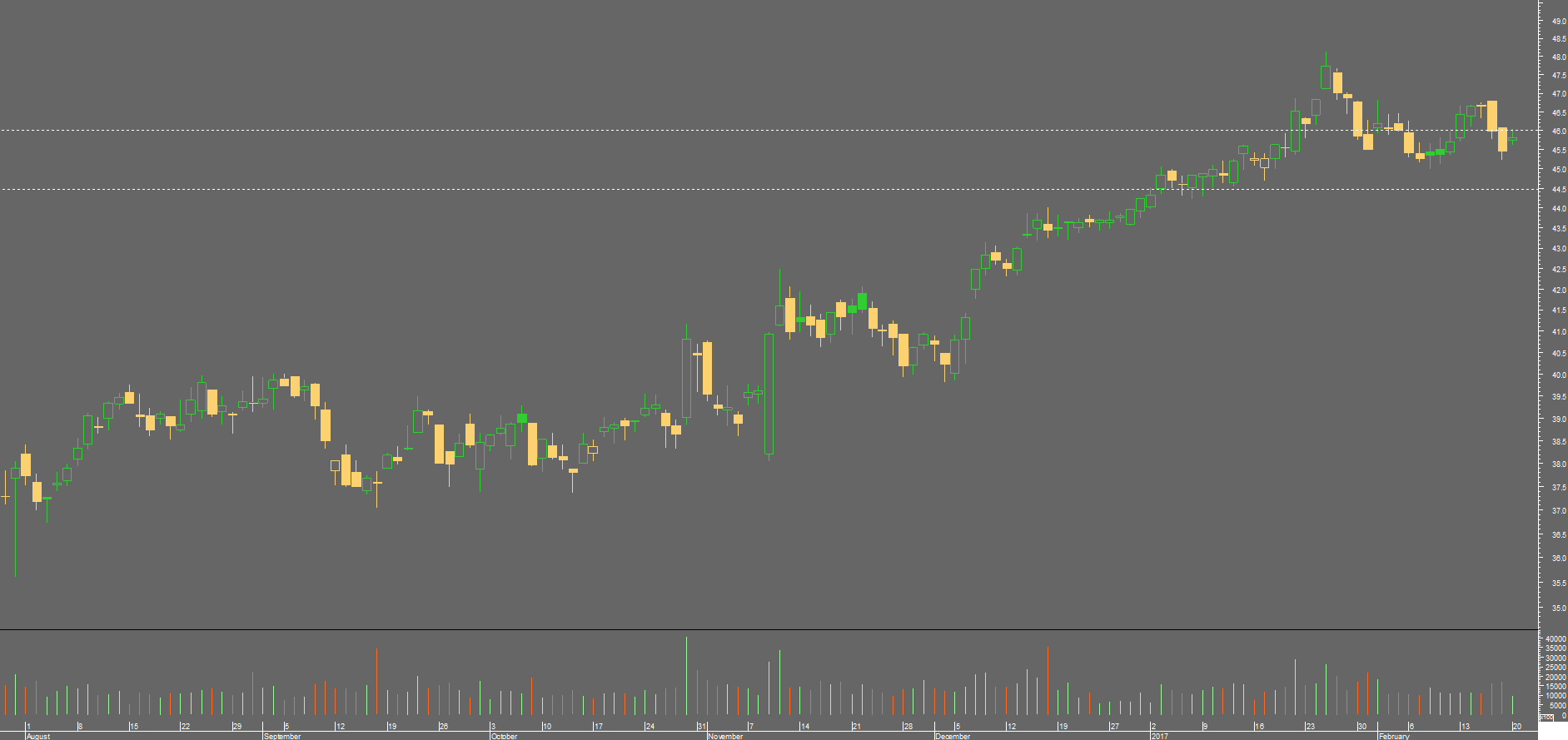 Este papel está em máximos de anos, tracei ali na zona dos 44.50 / 45.00 um possível resistência que tenha sido quebrada, será que passou a ser uma zona de suporte? já podemos dar aquela zona como quebrada?