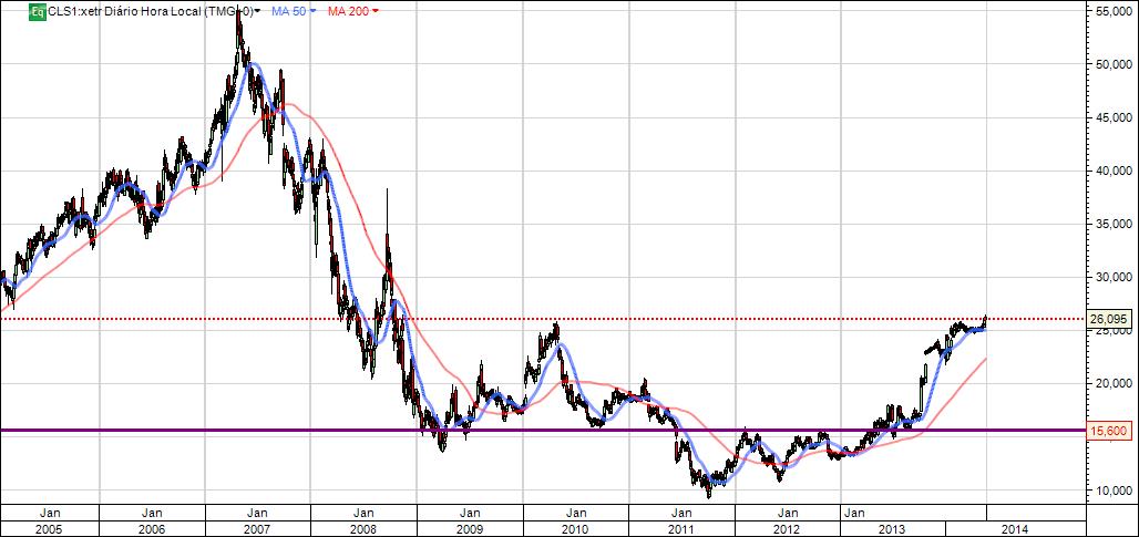 A Celesion, é parte integrante do MDax. Nos últimos 2 anos transacionou sempre abaixo da zona dos 15,75€. Teve duas tentativas de quebra em alta deste valor em 2012, mas sem sucesso. Neste momento já cota um pouco acima desta zona e sendo um possivel breakout.