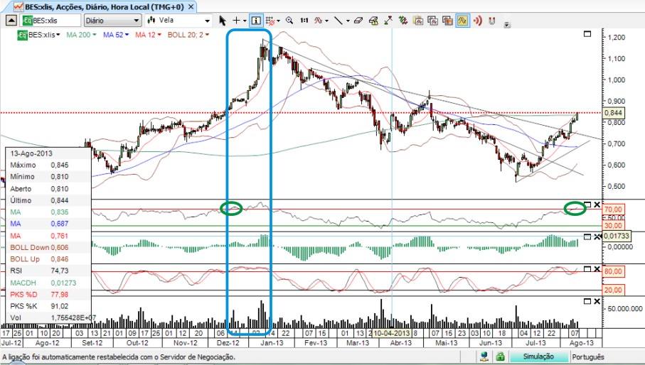 O movimento descendente iniciado em Janeiro último, apenas teve um movimento de correção, "normal", antes de Julho, visto durante Maio e Junho, o Bes ter perdido bastante valor. Atingindo o mínimo de € 0,52 a 03.07.2013.