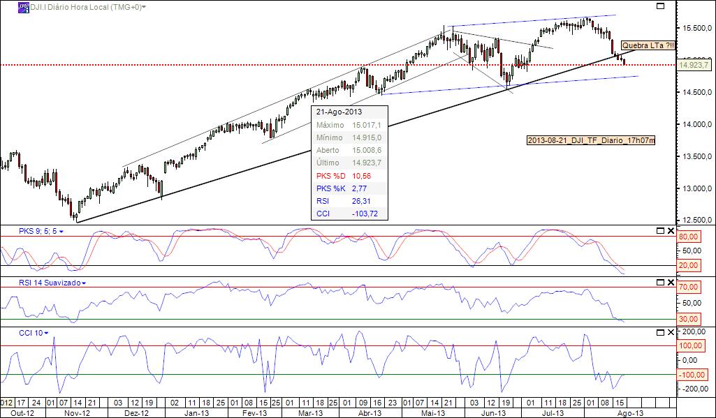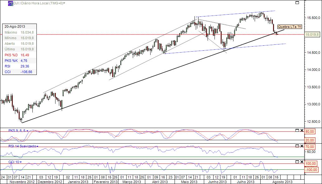Ainda que o gráfico seja em cfd's, o qual não difere muito do cash, o DJI quebrou a LTa.