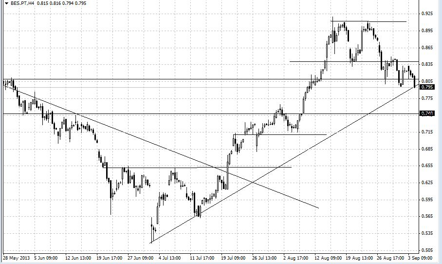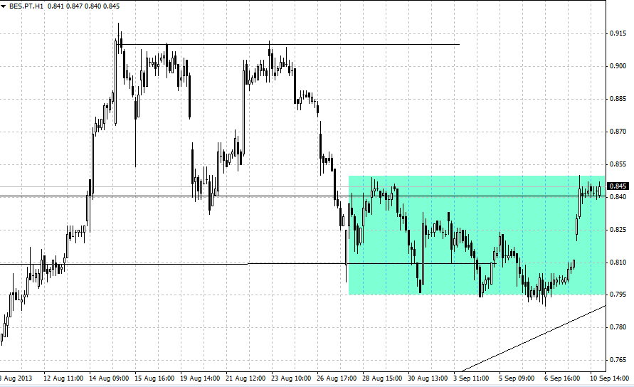 A minha análise é de que, BES está num suporte forte (0,80) que só será quebrado por acontecimentos muito maus, como por exemplo mais especulação/ansiedade em relação à Síria; continuação da escalada dos juros no mercado secundário;etc..