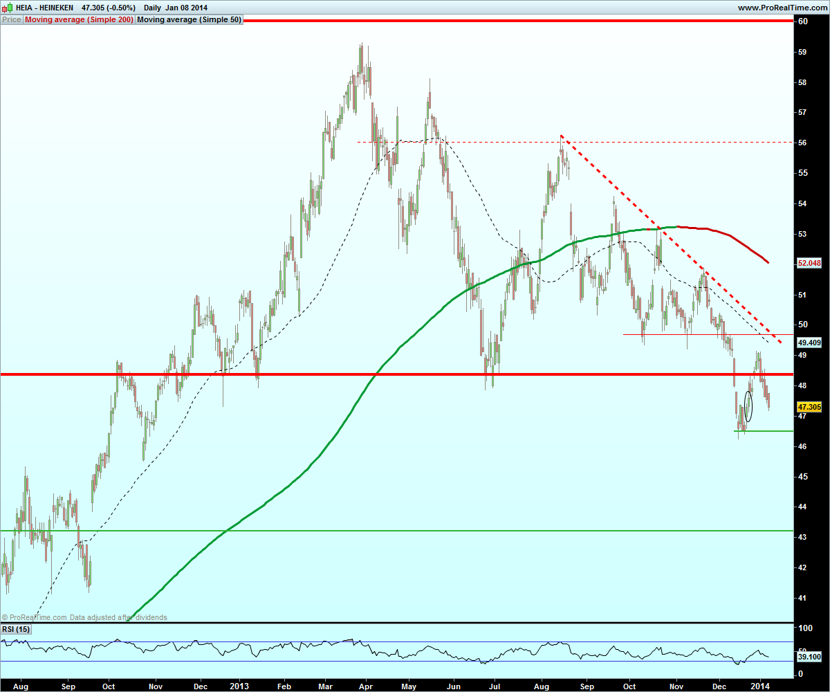 Por acaso também estive a olhar para a Heineken este fim de semana e o traçado dos S/R's ficou ligeiramente diferente. Partilho a minha visão abaixo - a linha tracejada, S/R de menor prazo, está nos 49,5 aproximadamente. Enquanto andarmos acima dos 46, para mim ainda estamos em correção e não em inversão.