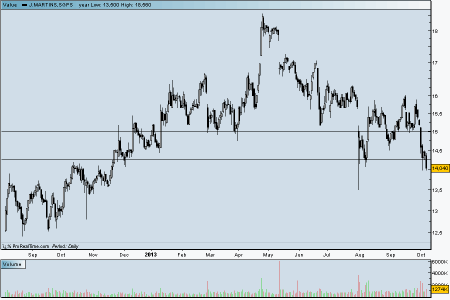 Relativamente à JM, não tenho sido um grande investidor neste papel. Por isso esta situação faz-me lembra quando estamos numa fila de transito e decidimos mudar porque a outra está a andar mais depressa. Depois de mudarmos a outra é que arranca. Além das perdas que estou a ter o que mais me chateia é não estar a aproveitar o rally da banca que era mais do que previsível. Foi uma má gestão de carteira. A acção tem dado sinais de fraqueza e rompeu na descendente uma LTA de curto prazo que tinha identificado (provavelmente com pouco valor). Estou muito pessimista. O que acham?
