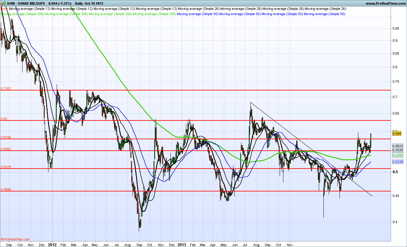 Um fecho acima dos 0,58 activará a bandeira de alta com target nos 0,63. O padrão é como nos livros, muito volume no mastro da bandeira e depois volume reduzido na consolidação. Hoje já testou essa resistência e espero nos próximos dias que faça o breakout.