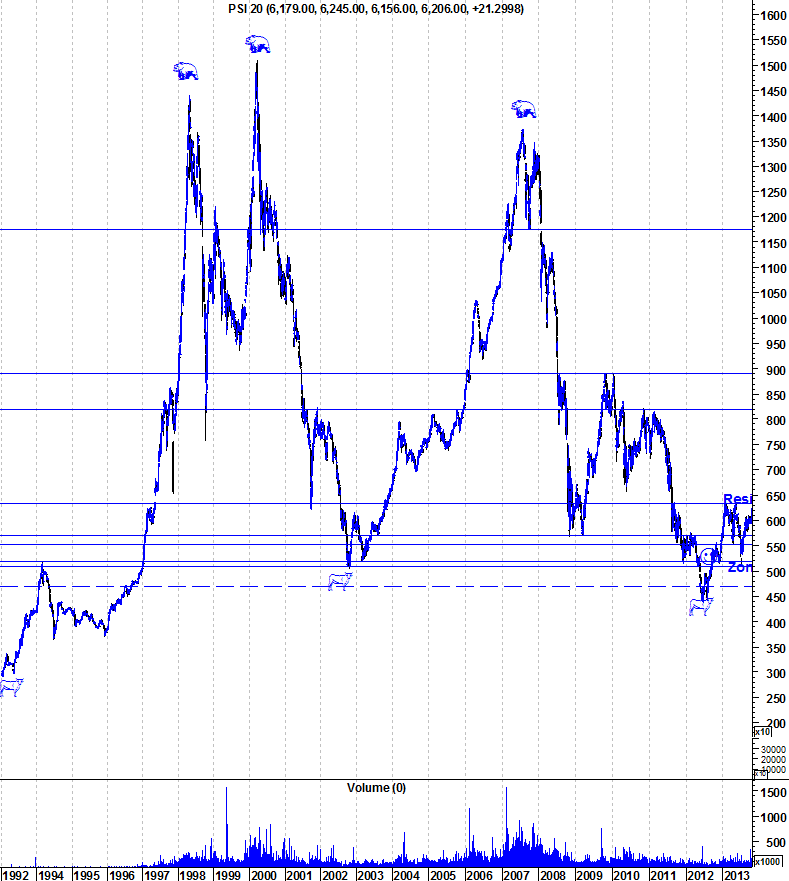 Desde os máximos de 2007 até aos mínimos do "bear market", o Sonae SGPS ( a acção "grande barómetro") caiu mais que o PSI20, o "normal", a primeira +-80% e o PSI20 pelos +-70%, neste momento após as subidas do ano passado o PSI20 está +- 120% dos máximos de 2007 e a Sonae SGPS a +-80%., e como referes "Nas acções, se escolheres as certas, baterás o índice", e quando se confirmar a ruptura dos 6350/6400 pontos consistentemente da reforçar o "bull market", isto poderá indicar que Sonae SGPS não terá um desempenho superior ao PSI20 ou será superior...