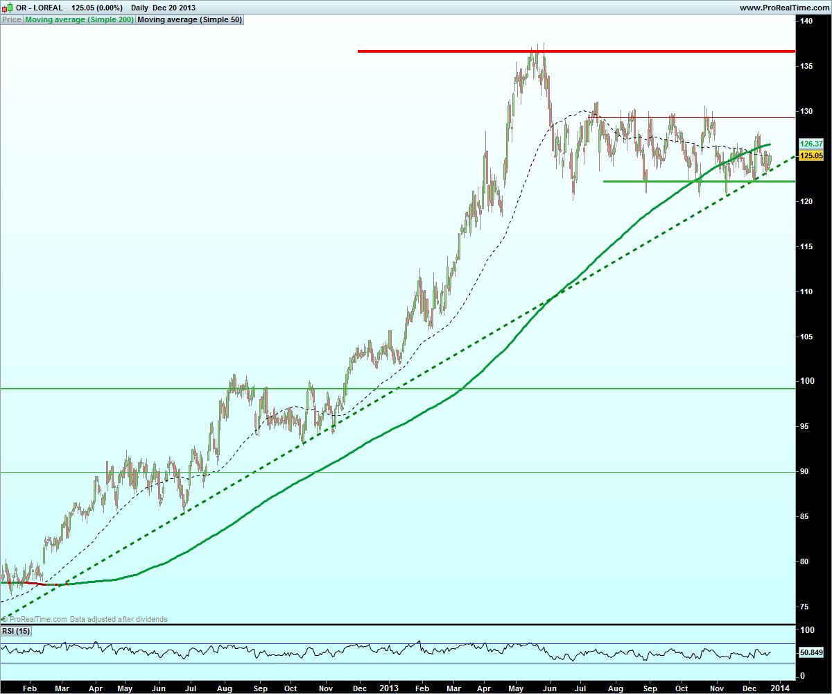 A LTA de 2012 foi definitivamente quebrada, a L'Oreal tenta agora desesperadamente manter-se acima da LTA que vem de 2011, enquanto prossegue a sua lateralização entre os 120,5 e os 129.