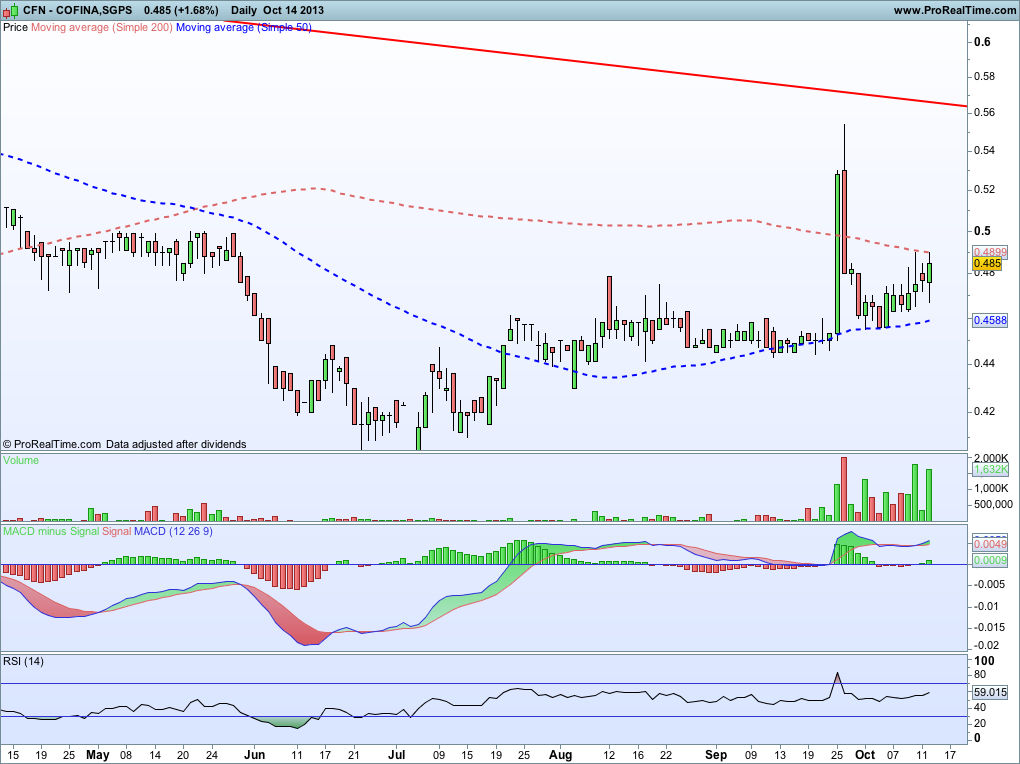 Excelente dia. volume extraordinário e a resistência dos 0,50€ quebrada em alta. Neste momento parece-me que se encontra pronta para atacar a "tal" LTD, (mesmo que nos próximos dias se possa assistir a alguma correcção) a ver vamos se resta força aos touros para a quebrar. Neste momento estou muito otimista para que essa quebra possa ocorrer, suportando essa ideia no volume das últimas semanas que demonstra um crescente aumento de interesse na acções da Cofina, e no presente estado do PSI20.
