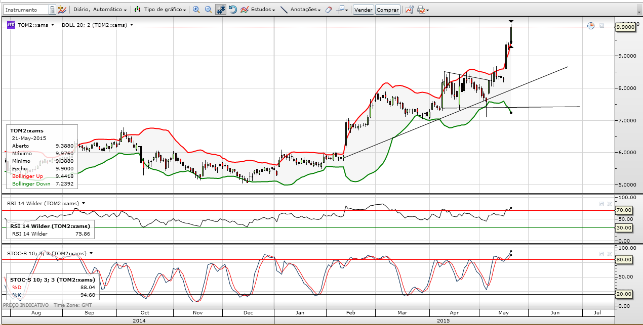 A TomTom é uma acção que me intriga como alterou o seu comportamento nos últimos anos. Até meados de 2011 era impressionante o sobe e desce. Recordo-me de várias vezes inverter de ganhos de 5% para perdas de 20% no mesmo dia e vice-versa. Nos últimos 2 anos navega suavemente num canal entre os 3€ e 4€ (houve uns poucos falsos breaks até aos 2,5 e 4,5 mas foram excepções). Volume a decrescer, aproximação aos 4€, será de entrar curto, não?