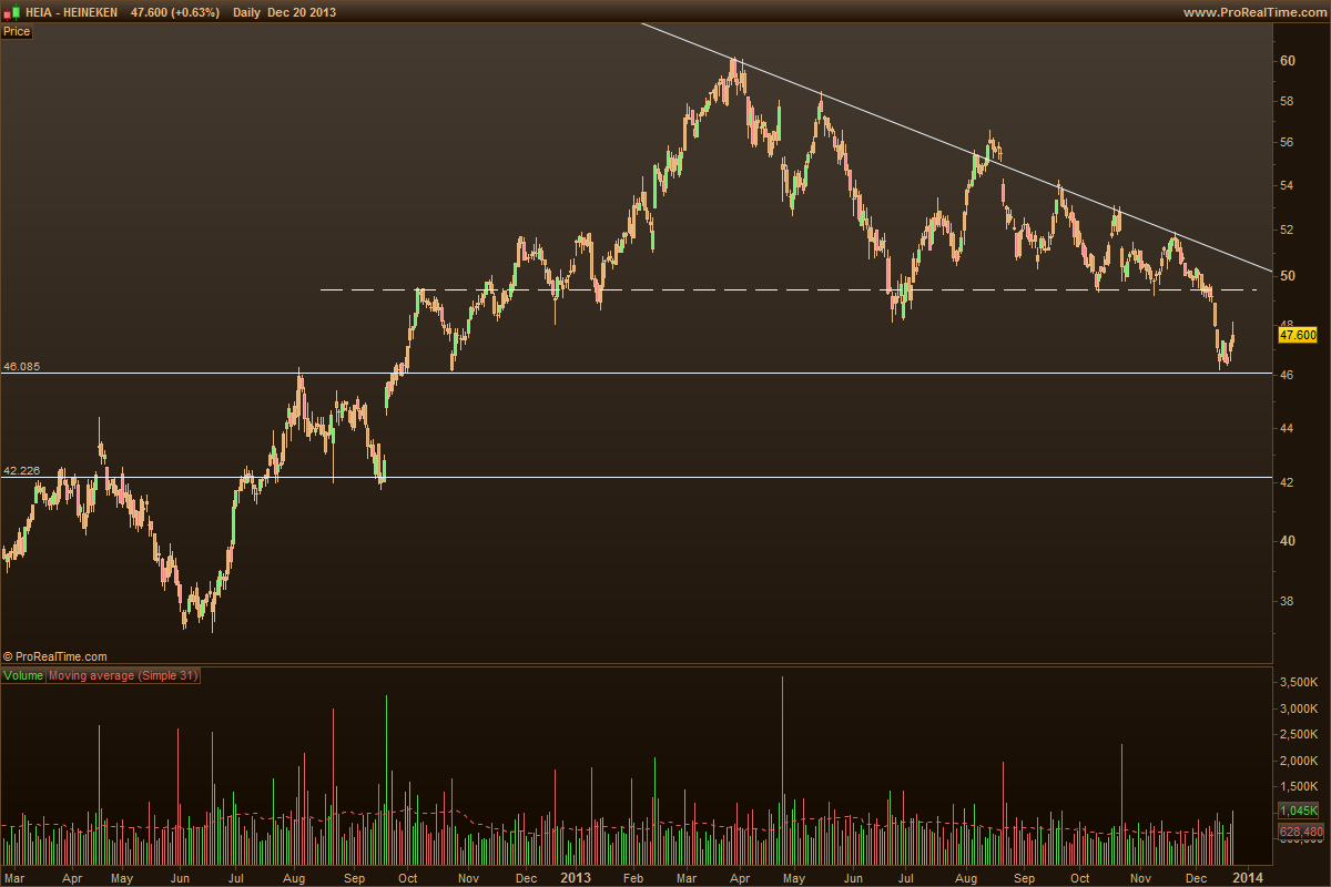 Por acaso também estive a olhar para a Heineken este fim de semana e o traçado dos S/R's ficou ligeiramente diferente. Partilho a minha visão abaixo - a linha tracejada, S/R de menor prazo, está nos 49,5 aproximadamente. Enquanto andarmos acima dos 46, para mim ainda estamos em correção e não em inversão.
