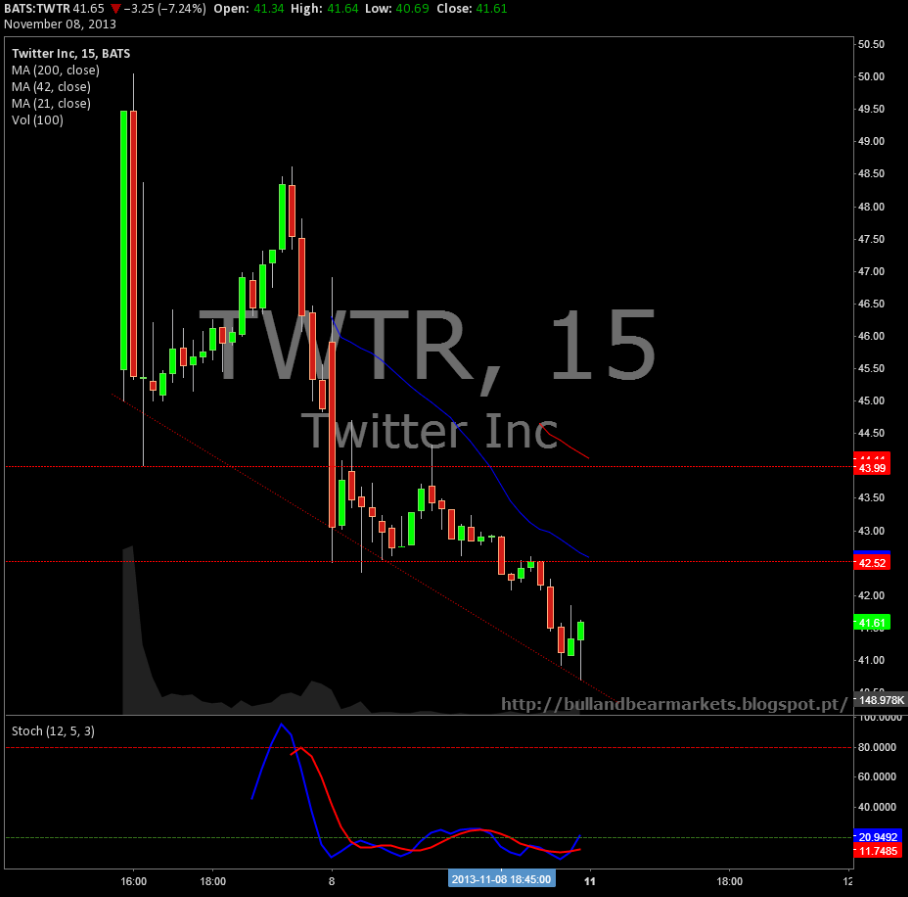 tugadaytrader Escreveu:Perto das 16h00 (horário de Lisboa), assim que começaram a ser negociados, os papéis, com o símbolo "TWTR", eram cotados a US$ 50 – o preço inicial das ações foi estabelecido em US$ 26. Minutos depois, os papéis chegaram a ter valorização de mais de 92%.