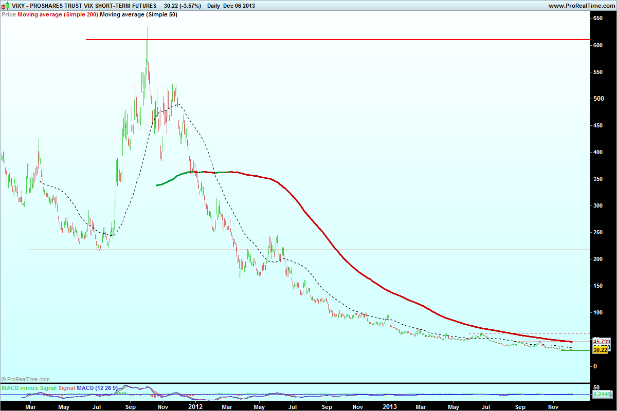 Não aconselho ninguém a entrar longo neste produto. Ler bem o folheto deste ETN (é um Exchange Traded Note e não um ETF) para perceber em que consiste antes de abrir uma posição. Não faz nenhum "tracking" do VIX, mas sim de dois meses dos futuros do VIX, o que é bem diferente. Tem um factor contango enorme, o que vai desgastando o valor ao longo do tempo.