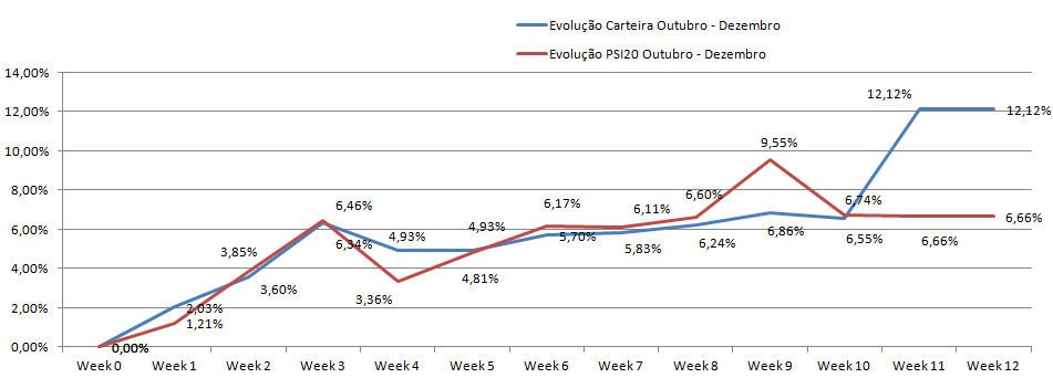 Mas como o objetivo não é tornar-me milionário com a bolsa mas sim trazer o maximo possível arriscando o minimo, esta foi a estratégia que achei mais segura. Não digo que não a poderei mudar alguma coisa, mas só na proxima carteira, ou seja, 01.01.2014... como se costuma dizer, ano novo, vida (estratégia) nova.. quem sabe?