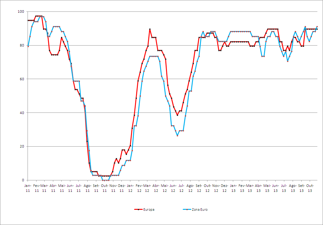O indicador da zona euro está agora nos 88, o indicador europa está nos 79. Ambos estão fora da zona de perigo, que se situa abaixo dos 75.