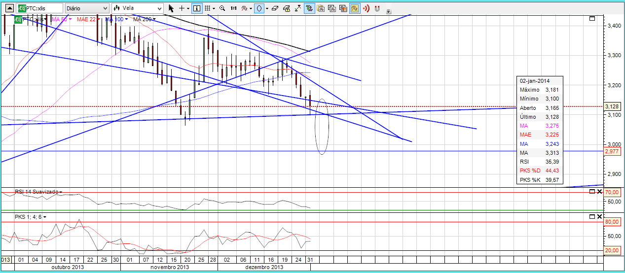 Eu apenas consigo ver uma tendencia de descida, com um suporte na casa dos 3.05/3.08 que segurou a acção em junho e julho de 2012 e novamente em novembro de 2013, este suporte faz-me acreditar que poderá travar descidas no curto prazo. A ver vamos.
