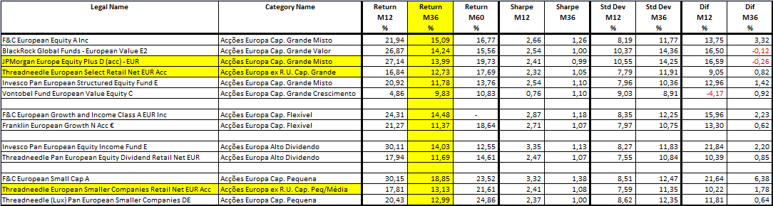 Nas colunas "Dif", os prémios em %, de risco vs. retornos (Ret - Std Dev), é um dos 2 fundos com perca do prémio de risco a 3 anos, o outro é também o mais arriscado. Reparem no Vontobel, bem calminho na volatildade, mas depois os retornos fraquinhos em comparação com os restantes. O mais equilibrado nos retornos é o Threadneedle Euro. Select, pois os outros fundos para terem os retornos a 3 e 5 anos perto deste fundo, tiveram que dar no último ano, mais retorno do que o Threadneedle, entre 4-11% de diferença.