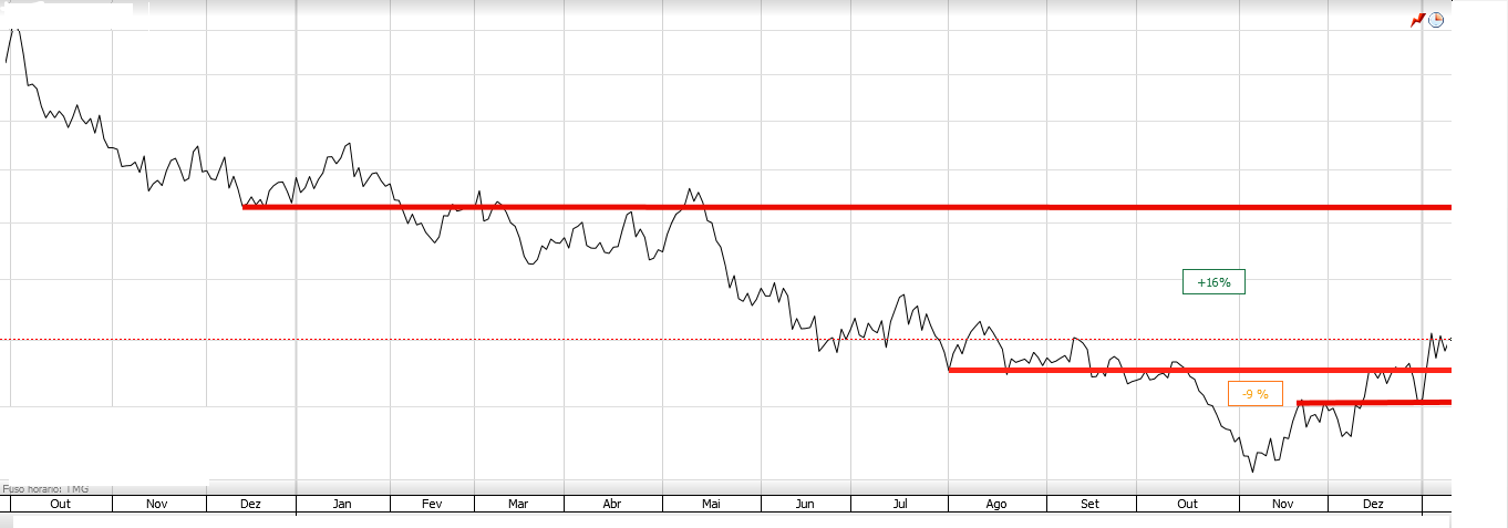 se o café fizer um higher high (vencer aquela pequena resistência no gráfico) e depois conseguir fazer um higher low, podemos falar de inversão da tendência