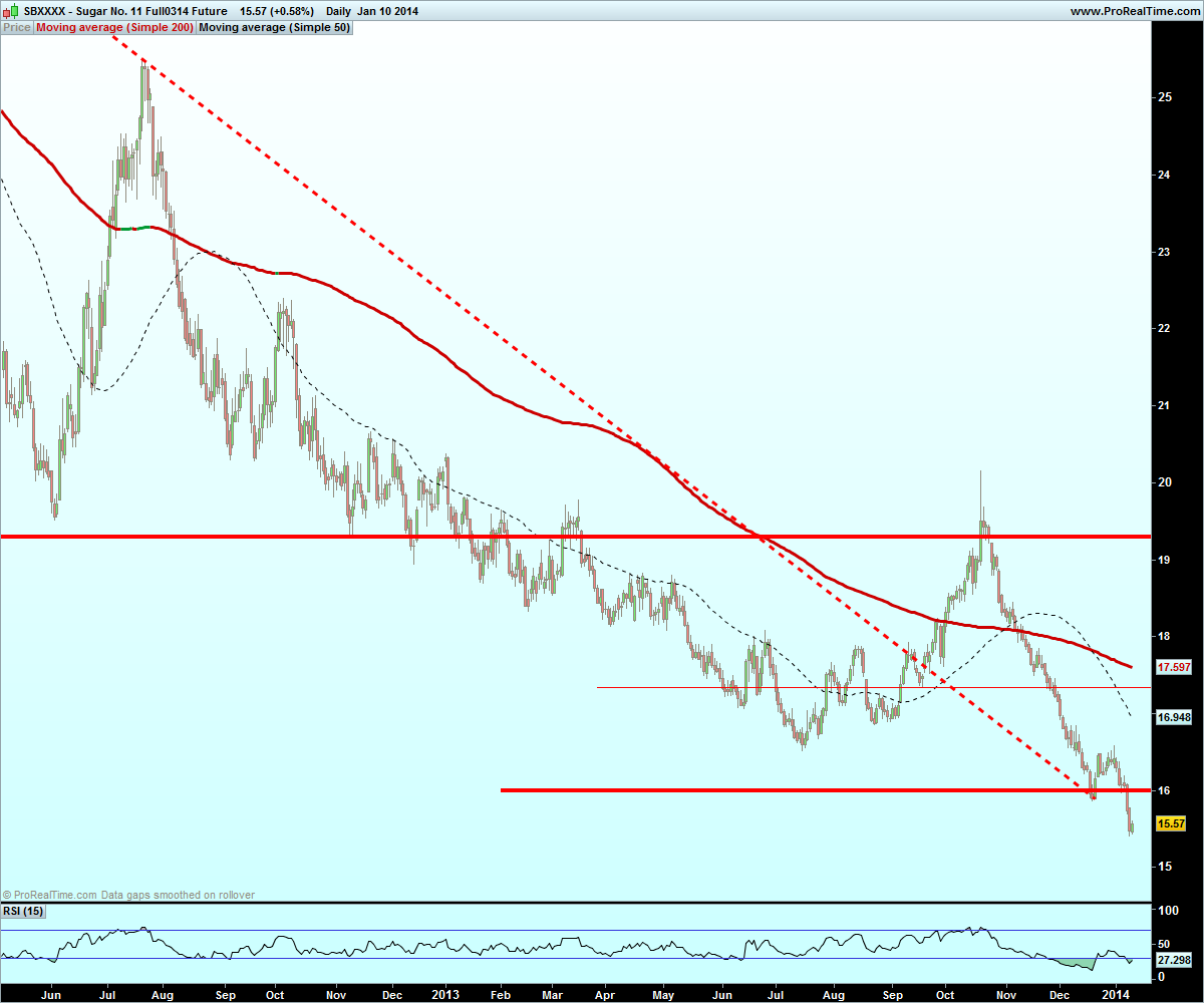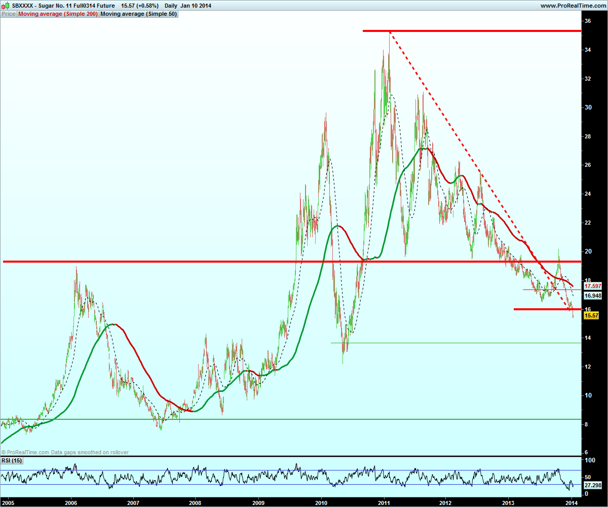A cotação do açúcar reage muito a eventos atmosféricos que ocorram no Brasil, Índia e México e não tem havido noticias que afectem a área de plantio. Os gráficos em vários "timeframes" não parecem muito construtivos para a subida de cotação e o preço do crude também não aumenta a procura de matéria-prima para ethanol.
